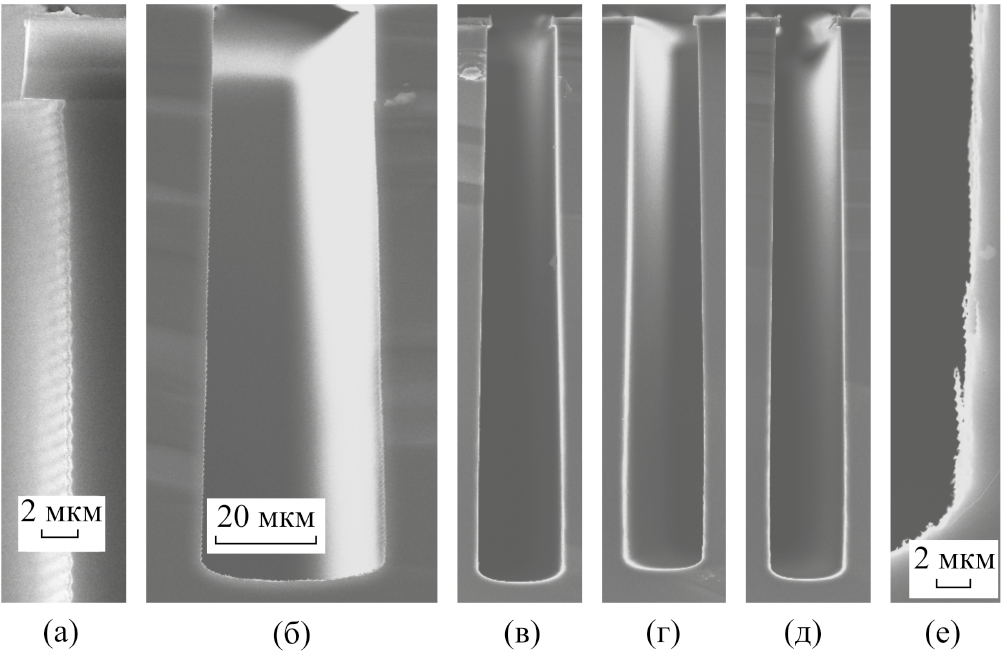 Результаты травления в процессах TMDSE с разным временем стадии “удаление” tbias при одинаковой величине R = 0.17 (tr = 2.2 с) представлены на рис. 5. Наиболее выраженное отличие профиля при заданных значениях: tbias – 4 с (Δ = 1.8 с) и 3 с (Δ = 0.8 с) наблюдается в нижней части канавок (рис. 5а, б). В процессе травления со сравнительно низким значением Δ = 0.8 с локальный угол наклона стенок канавок на глубине более 290 мкм становится положительным, т.е. критическое значение аспектного отношения ARc достигается до момента окончания травления (h = 338 мкм). При более высоком значении Δ = 1.8 с локальные углы наклона стенок остаются отрицательными по всей глубине канавок. Различная форма профиля в данных экспериментах обусловливает разные значения среднего угла наклона стенок – 0.96° (Δ = 1.8 с) и 0.58 (Δ = 0.8 с). Таким образом, разность Δ является фактором, контролирующим форму профиля. В процессах TMDSE с низким значением Δ=0.8 с наблюдается ухудшение качества поверхности стенок, которое взаимосвязано с искажением формы профиля в нижней части канавок (рис. 5б, в). Текстура поверхности в виде гребешков становится менее выраженной в средней части, где вместе с изменением локального наклона, на стенке образуются одиночные бороздки шириной ~1 мкм (рис. 5г). Грубая текстура поверхности стенок начинает проявляться в нижней части канавок, где происходит существенное изменение локального наклона стенок (рис. 5д).