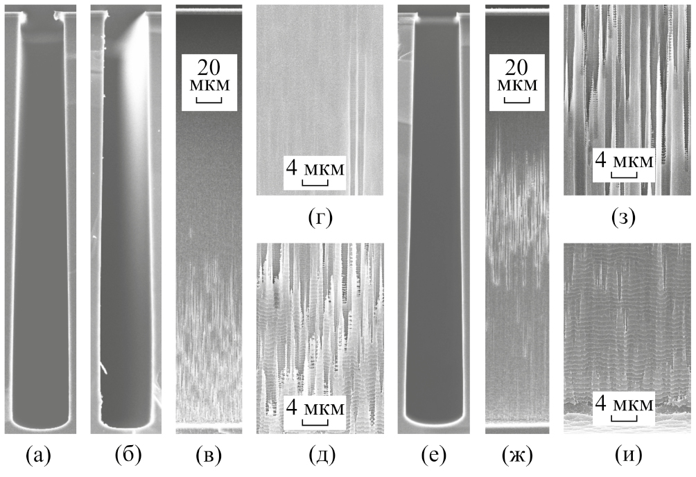 Искажение формы профиля в процессах травления с низким значением Δ может быть объяснено недостаточно полной очисткой поверхности в течение стадии “удаление”. Плотность ионного потока на центральную область поверхности дна выше, чем на область вблизи стенки высоко-аспектной канавки, вследствие углового расхождения потока ионов. В результате происходит задержка очистки поверхности дна вблизи стенки (в углу канавки). Изложенные представления были проверены в эксперименте с последовательным изменением параметра Δ в процессе травления. Использовался рецепт TMDSE с сегментированным увеличением tbias, т.е. каждое следующее значение tbias задавалось на определенное количество циклов (N). Стартовый сегмент циклов выполнялся при значении tbias = 3 с соответствующего процесса TMDSE (N = 400) с фиксированным параметром Δ = 0.8 с (рис. 5б). Результат травления за 400 сегментированных циклов: первые 200 циклов — tbias = 3 с (Δ = 0.8 с), вторые 100 циклов — tbias = 3.5 с (Δ=1.3 с), заключительные 100 циклов — tbias = 4 с (Δ = 1.8 с), представлен на рис. 5е–и. В таком процессе достигается прямолинейный профиль стенок с углом наклона θ = 0.97°, совпадающим с углом наклона в верхней части канавки при травлении в соответствующем процессе с фиксированным значением tbias (рис. 5е). В средней части канавок на поверхности стенки наблюдаются множественные бороздки шириной ~1–2 мкм (рис. 5ж, з). При этом эффект образования грубой текстуры на поверхности стенок вблизи дна канавки подавляется (рис. 5и).