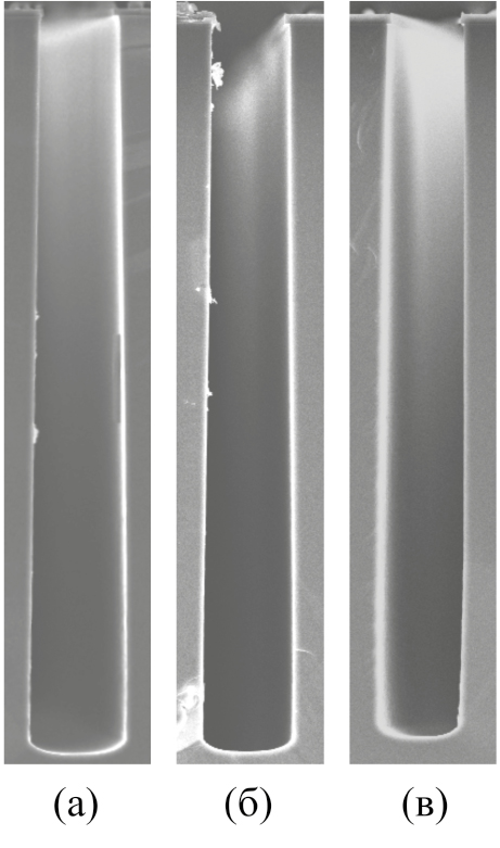 На рис. 6 представлены результаты травления в процессах TMDSE с увеличенным соотношением R в диапазоне 0.23–0.3 (td = 5 c, tbias = 3 c). В экспериментах с вариацией значения R в двух диапазонах: 0.13–0.2 и 0.23– 0.3, задавалось разное время стадии «осаждение», с целью получения близких диапазонов значения Δ(tr). Это дает возможность исключить фактор Δ при анализе профилей травления, полученных при разных соотношениях R. Канавки, полученные при высоких значениях R = 0.3, 0.27, 0.23 (рис. 6а–в) имеют углы наклона стенок меньше, чем в процессах с R = 0.2, 0.17, 0.13, соответственно (рис. 4в–д). Изменение среднего угла наклона стенок в зависимости от значения R в процессах TMDSE с одинаковым значением Δ объясняется усилением эффекта задержки удаления полимера в углу канавок. Увеличение задержки является косвенным признаком усиления фактора переосаждения.