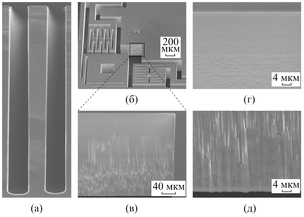 Травление «разрезных» канавок проводилось в режиме TMDSE со следующими параметрами стадии «осаждение»: td = 5 с, R = 0.23. В процессе травления использовалось сегментированное увеличение tbias: первые 350 циклов — tbias = 3 с (Δ = 0.6 с), вторые 100 циклов — tbias = 3.5 с (Δ = 1.1 с). Выбранный режим травления обеспечивает практически вертикальный профиль стенок «разрезных» канавок (θ = 0.36°) при средней скорости травления кремния 3.4 мкм/мин (55.4 нм/с). Средняя скорость травления SiO2 в таком процессе при разных значениях tbias составляла 0.13 нм/с (S = 426, tbias = 3 с) и 0.17 нм/с (S = 325, tbias = 3.5 с). Скорость травления фоторезиста ожидаемо больше скорости травления SiO2 в 2.9 раза. На рисунке 7а представлено изображение поперечного скола в месте расположения балластного островка между двумя “разрезными” канавками. В двухмерную топологию маски были заложены балластные элементы с разными размерами и формой для формирования различных полостей между элементами конструкции чувствительных элементов. На рисунке 7б представлено изображение фрагмента чувствительных элементов с некоторыми конструкционными элементами чувствительных элементов после заключительного процесса утонения и удаления балластных элементов кремния. Состояние поверхности стенок не получается идеальным, но учитывая высокую вертикальность профиля негативное влияние расходящегося потока ионов не удалось подавить полностью (рис. 7в). Интенсивность ионного воздействия на стенки в процессе изготовления чувствительных элементов больше, чем в тестовых экспериментах, так как края двухслойной маски имеют больший (~ 45°) угол наклона. В процессе травления кремния уход края маски в результате ее утонения составляет около 1.5 мкм, что обусловливает меньшую величину выступа Δ. В результате происходит сглаживание гребешков на поверхности стенок в верхней части профиля и легкое повреждение стенок в нижней половине профиля (рис. 7г, д).