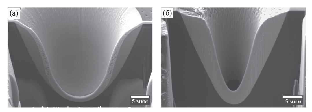 Изготовление алмазной микрооптики с радиусом кривизны менее 5 мкм и апертурой 20 мкм было впервые продемонстрировано на основе двулучевой (сфокусированный ионный пучок–растровый электронный микроскоп) системы с галлиевым источником ионов [13]. Дальнейшее развитие технологии [6] позволило изготовить полулинзу из более перспективного материала — нанополидисперсного алмаза — с радиусом кривизны 4 мкм [20]. Возможность получения микрооптики из аморфных материалов была продемонстрирована на примере борного стекла: апертура линзы А составила 15 мкм и радиус закругления R = 2.7 мкм. Также была продемонстрирована возможность создания линзы из монокристаллического кремния при A = 15 мкм и R = 2.3 мкм, время травления полулинзы составило 1.5 ч [4]. Все микролинзы изготавливали с использованием сфокусированного ионного пучка Ga+ с энергией 30 кВ при токе 3 нА на двухлучевой установке Zeiss Crossbeam 540. Шероховатость оптических поверхностей линз и ошибка формы при данных параметрах колонны составили менее 30 и ~50–100 нм соответственно.