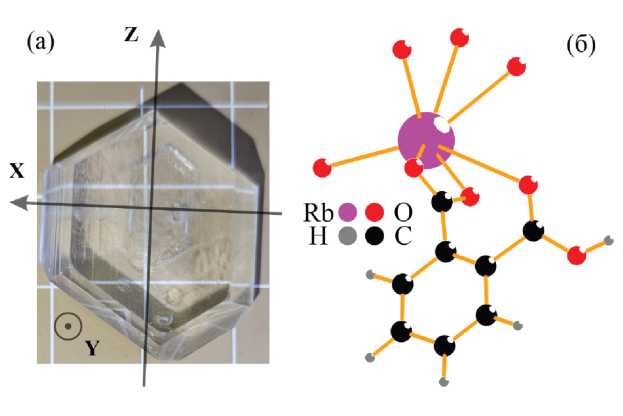 Кристаллы гидрофталатов рубидия C6H4COOH·COORb и калия C6H4COOH·COOK являются изотипными [9, 33], поэтому обладают рядом схожих свойств, обусловленных аналогичной кристаллической структурой. Кристалл RbAP относится к полярному нецентросимметричному классу mm2 ромбической сингонии. Для привязки кристаллофизической системы координат была выбрана пространственная группа симметрии Pca21 (№ 29), ранее установленная в [34, 35], что отличается от некоторых работ, в которых ранее выбирались нестандартные представления пр. гр. P21ab [33, 36] и P21ca [37]. Габитус выращенного кристалла RbAP аналогичен габитусу кристалла KAP. Он представлена на рис. 1a, где также указаны направления осей кристаллофизической системы координат выбранной пространственной группы. Кристалл уплощен в направлении [010]. За кристаллофизическую ось Z принимается направление [001], которое является полярным [9], как и для KAP [8]. Нормаль к совершенной плоскости спайности (010) принимается в кристаллах RbAP за ось Y.