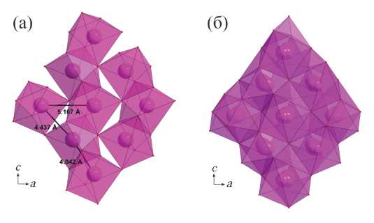 Структура кристаллов гидрофталата рубидия хорошо известна. Структурные единицы — щелочные катионы Rb+ и анионы орто-фталевой кислоты (рис. 1б). Особенность структуры — гофрированные слои катионов в плоскости ас. Гофрирование возникает вследствие связывания катионов в слое винтовой осью 21. Ионная связь Rb–O (длины связей 2.78–3.26 Å) обеспечивает высокую подвижность ионов Rb в структуре. В структуре есть две плоскости спайности. Плоскость (100) является плоскостью несовершенной спайности. Она проявляется при высоких температурах [38] и больших деформациях [39] в отличие от плоскости совершенной спайности (010), которая проходит между слоями орто-фталевой кислоты, связанными силами Ван-дер-Ваальса. Плоскость (100) проходит между углеродными кольцами слоя молекул кислоты и пересекает связи Rb–O и водородные связи. Для разрушения этой плоскости помимо ван-дер-ваальсовых связей, характеризующихся низкой энергией, следует разорвать водородные и ионные связи, энергия которых значительно выше. В недавнем исследовании монокристаллов гидрофталата рубидия при 295 и 85 К [40] установлено, что атомы рубидия разупорядочены относительно своих основных кристаллографических позиций. При комнатной температуре (a = 10.0546(1), b = 13.0564(2), c = 6.5592(1) Å, V = 861.07(2) Å3) тепловые смещения атомов настолько велики, что невозможно локализовать дополнительные позиции атомов Rb на разностных картах Фурье электронной плотности. В результате рентгеноструктурного исследования при 85 К (a = 10.0165(1), b = 12.9722(1), c = 6.4899(1) Å, V = 843.26(1) Å3) установлено, что 96% атомов Rb заселяют базовые кристаллографические позиции, а 4% распределены по пяти дополнительным позициям, находящимся на расстояниях ~0.4–0.5 Å от основных позиций. Расщепление позиций “увеличивает” подвижность ионов Rb в структуре. В нерасщепленной модели при комнатной температуре полиэдры в направлении оси а соединяются вершинами, а вдоль полярной оси с – гранями (минимальное расстояние Rb–Rb 4.042 Å) (рис. 2a). В полученной при 85 К расщепленной модели (рис. 2б) все полиэдры соединяются гранями, расстояния между катионами рубидия сокращаются — минимальное расстояние 3.78 Å. Такая конфигурация атомов облегчает их перескоки в плоскости ас в пределах гофрированного слоя.