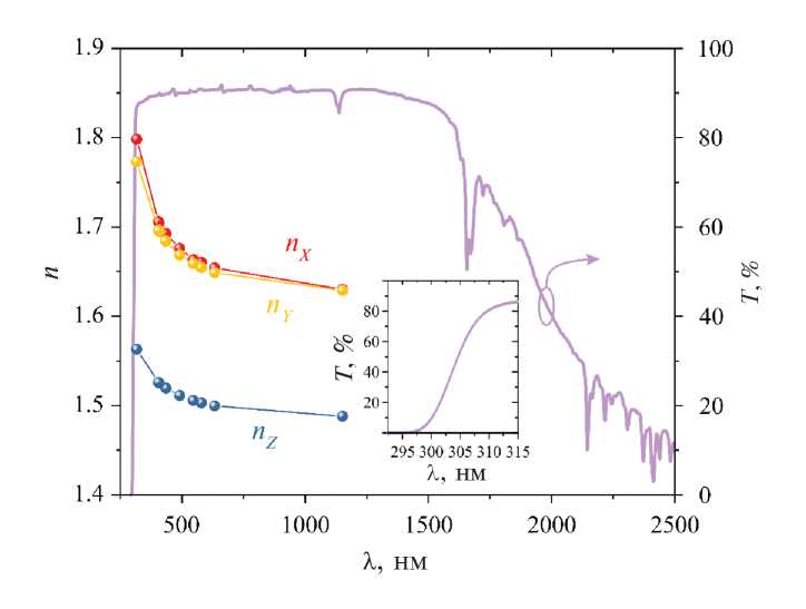 Рис. 3. Коэффициент пропускания T кристалла RbAP в УФ, видимом и БИК-диапазонах длин волн в неполяризованном свете (толщина образца составляла 826 мкм) (вставка изображает спектр пропускания в диапазоне длин волн от 297.5 до 315 нм) и коэффициенты преломления nx, ny, nz для трех выделенных направлений [9].
