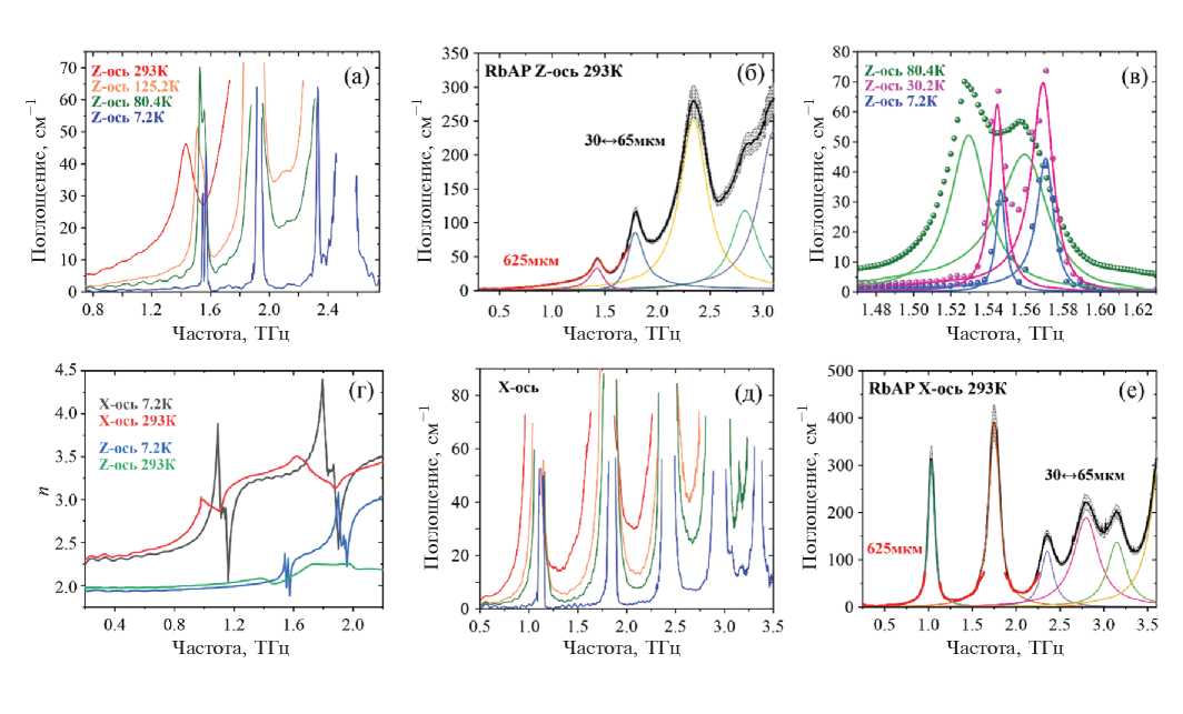 В связи с большим поглощением в области фононных резонансов в кристалле RbAP в качестве образцов при 293 К использовался набор тонких пластин (010) толщиной 30–65 мкм. Поглощение для выделенного направления Z при температуре 293 К характеризуется тремя пиками в диапазоне частот 0.2–2.6 ТГц (рис. 4б).