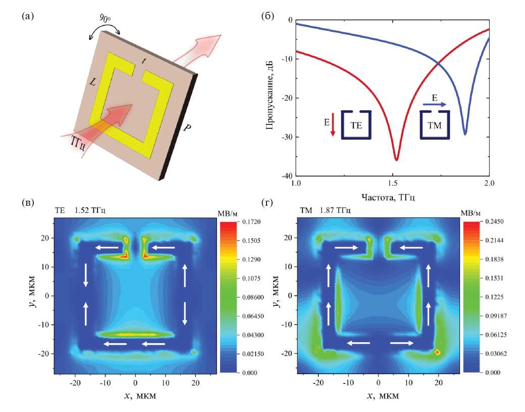 На рис. 6б изображена модельная зависимость амплитуды пропускания ТГц-поля от частоты для разработанной периодической структуры типа SRR. Такая структура является поляризационно селективной, т.е. резонансные характеристики зависят от ориентации падающего электрического поля относительно плеча зазора SRR (рис. 6б). В диапазоне от 1 до 2 ТГц наблюдаются два дипольных резонанса, один на частоте 1.52 ТГц для TE (transverse electric) поляризации, второй на частоте 1.87 ТГц для TM (transverse magnetic) поляризации. Наличие таких резонансов обусловлено тем, что падающее электрическое ТГц-поле возбуждает плазмонные колебания электронов проводимости на поверхности элементов SRR, параллельных падающему полю, создавая набор диполей, осциллирующих на характерных резонансных частотах. Также для этой структуры существует LC-резонанс на частоте 0.66 ТГц, однако в настоящей работе он не рассматривается. На рис. 6в–г представлено распределение электрического поля на поверхности элементарной ячейки метаструктуры на резонансных частотах 1.52 ТГц (TE) (рис. 6в) и 1.87 ТГц (TM) (рис. 6г). Максимальное значение напряженности электрического поля составило 0.17 и 0.25 МВ/м для резонансной частоты 1.52 и 1.87 ТГц соответственно. Также рассчитаны значения FWHM максимумов пропускания и показатель добротности . Для резонанса на частоте 1.52 ТГц FWHM = 0.23 и Q = 6.6, для резонанса на частоте 1.87 ТГц FWHM = 0.12 и Q = 15.6.