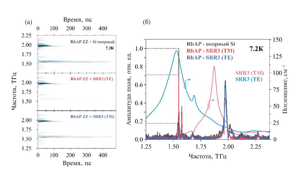 Сгенерированное в кристалле RbAP при температуре 7.2 К терагерцевое излучение пропускалось через двумерный метаматериал SRR3. Так как резонансы поглощения в таком метаматериале зависят от взаимной ориентации структуры и поляризации ТГц-импульса, подобная комбинация мультиспектрального узкополосного источника и метафильтра может позволить селективное переключение между дискретными спектральными линиями излучения.