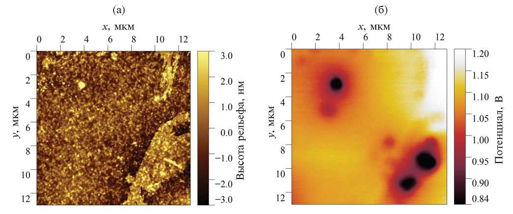 Морфология поверхности образцов была исследована с помощью сканирующего зондового микроскопа (СЗМ) Ntegra Prima (НТ-МДТ Спектрум Инструмент, Россия) в полуконтактном режиме, сигнал поверхностного потенциала регистрировали на втором проходе с применением зонда Кельвина на высоте 50 нм от поверхности пленок. При измерениях использовали кантилевер марки NSG10/Pt (НТ-МДТ СИ) с жесткостью 8 Н/м и резонансной частотой свободных колебаний 210 кГц. Обработка полученных изображений осуществлена в программе Gwyddion (версия 2.60) [14].