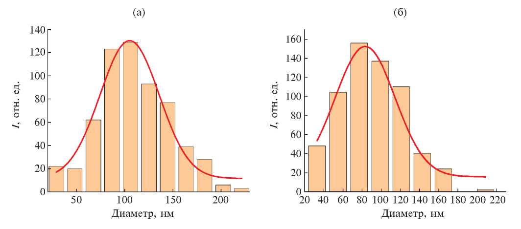 Гистограммы распределения радиуса частиц в исследуемых образцах представлены на рис. 3. Полученные зависимости хорошо описываются гауссовским распределением, согласно которому для образа после имплантации средний размер частиц составил D1 = 105 ± 3 нм (рис. 3а), а для отожженного образца — D2 = 83 ± 3 нм (рис. 3б).