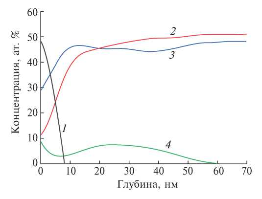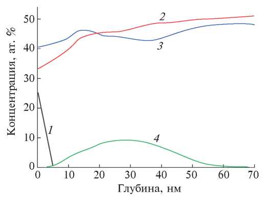 Рис. 5. Профили концентрации элементов после имплантации: 1 — O; 2 — N; 3 — Si; 4 — Zn.