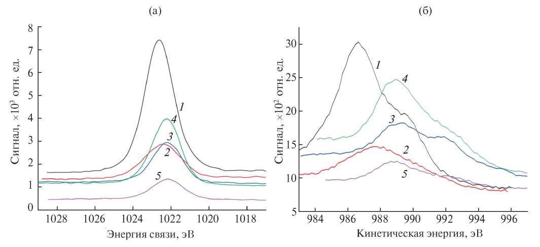 Рис. 8. РФЭС (а) и оже-спектры (б) состояния Zn2p3/2 и перехода L3M45M45 образца после отжига при 700°С, полученные от области на глубине 0 (1); 2.7 (2); 13.3 (3); 29.2 (4); 50.4 (5).