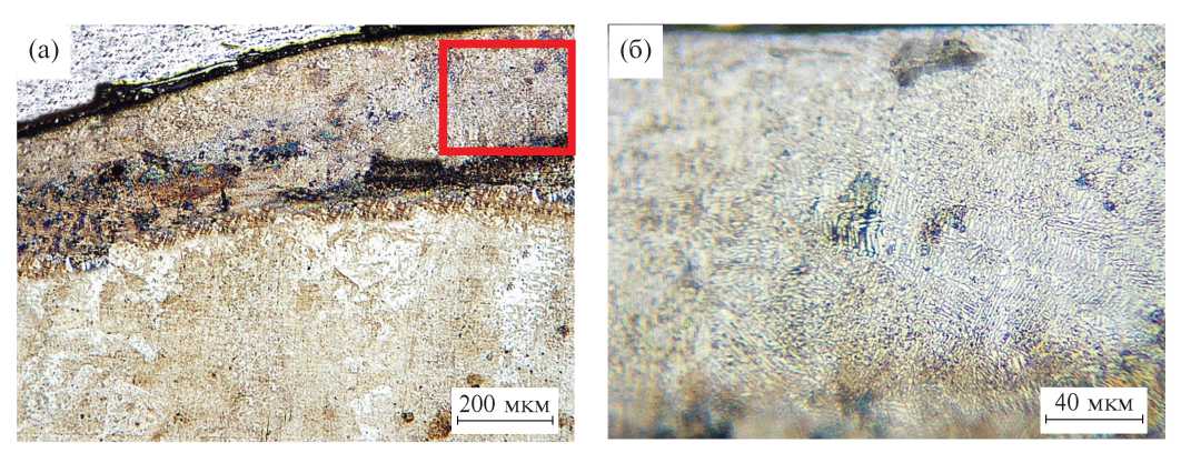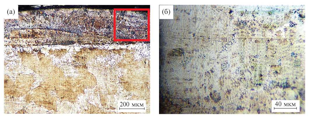 Рис. 5. РЭМ-изображение образца стали У10 после боромеднения с последующей обработкой электронным пучком (а) и увеличенный участок, выделенный квадратом (б).