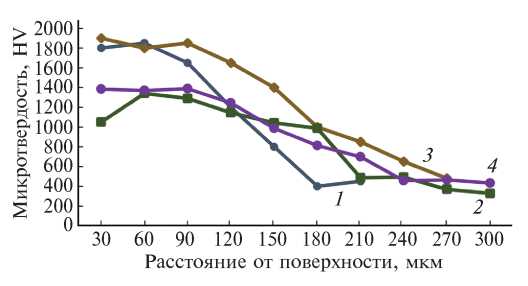 Рис. 6. Распределение микротвердости образцов сталей 45 (1, 2) и У10 (3, 4) после химико-термической обработки (1, 3) и боромеднения с последующей обработкой электронным пучком (2, 4).