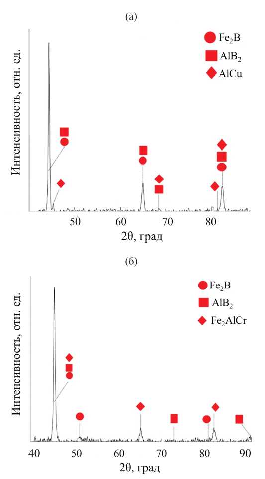 Рентгенофазовый анализ показал, что диффузионный слой стали 45 состоит из фаз Fe2B, AlB2 и AlCu (рис. 7). Алюминий в состав стали 45 не входит, его присутствие в поверхностном слое может быть вызвано попаданием из насыщающей смеси при химико-термической обработке. Наличие фазы FeB не подтверждено, о чем свидетельствует табл. 2, количество бора соответствует только фазе Fe2B. Диффузионный слой стали У10 состоит из фаз Fe2B, AlB2 и Fe2AlCr. Предположительно, диффузионный слой был легирован алюминием в процессе химико-термической обработки.