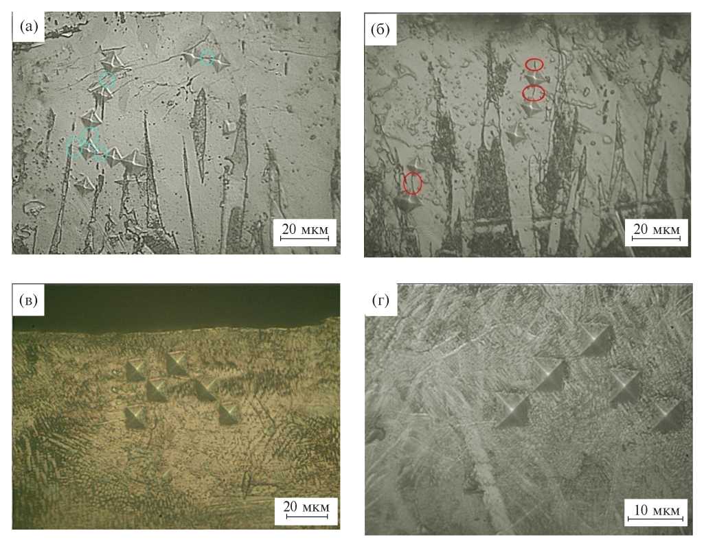 Примечание. После боромеднения совместно с обработкой электронным пучком трещины между отпечатками не обнаружены (рис. 8в, г).