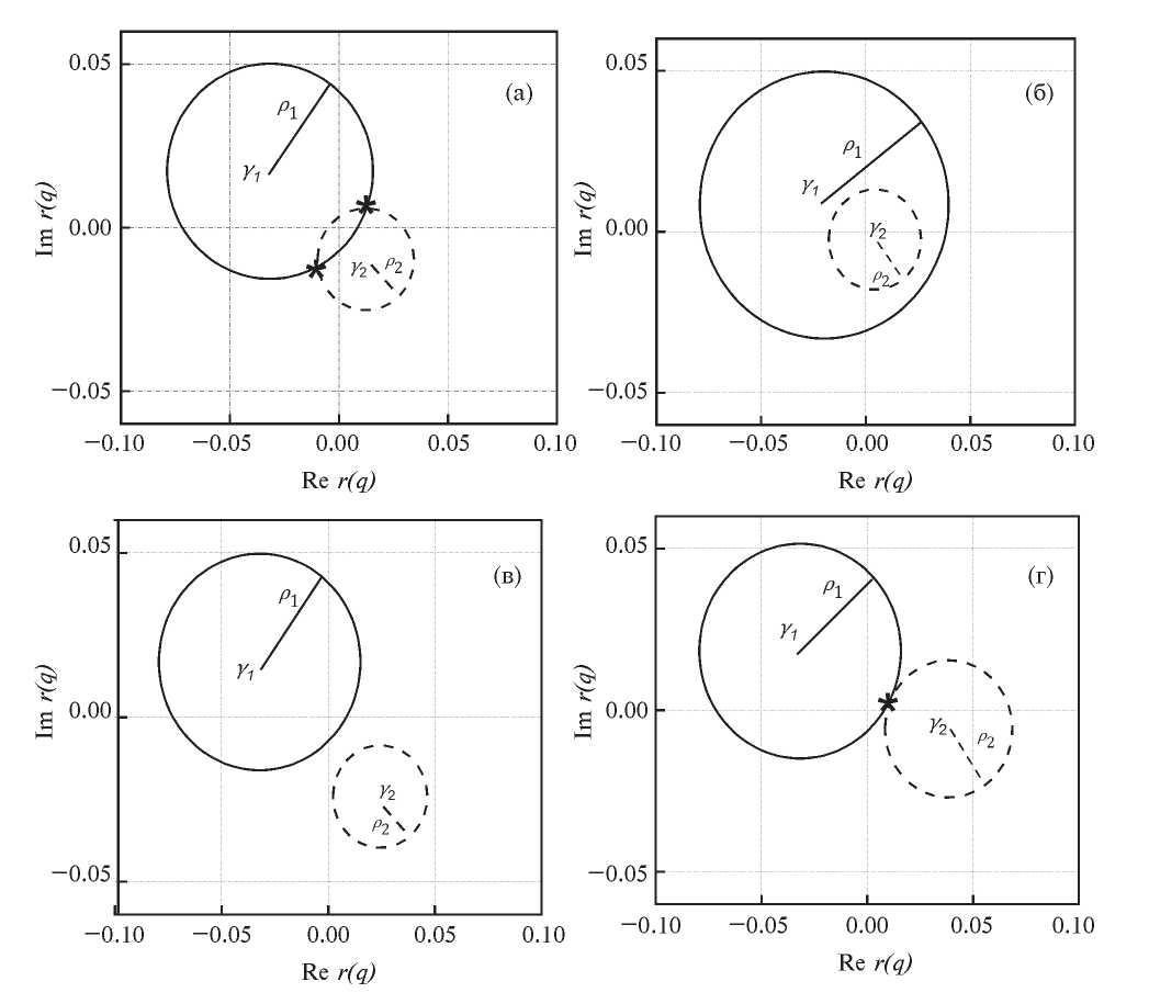 При проведении двух экспериментов расчет амплитуды отражения осложняется тем, что вместо одного решения будет два, так как в общем случае, две окружности пересекаются в двух точках (рис. 1а). Возможны частные случаи: когда окружности пересекаются лишь в одной точке (рис. 1г) и когда окружности не пересекаются, так как находятся далеко друг от друг либо одна в другой (рис. 1б, 1в). Случаи, приведенные на рисунке 1б и 1в, указывают на ошибку при проведении эксперимента или обработки данных. Для реальных физических систем возможны только случаи 1а и 1г, потому что у реальной системы обязательно есть ненулевая амплитуда отражения и окружности не могут не пересекаться.