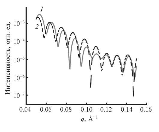 Рис. 2. Модельные рефлектометрические кривые для структуры Al2O3//Ti(500 Å)/V(20 Å)/Gd(50 Å)V(50 Å) для двух углов падения 3.3 мрад (1) и 10.1 мрад (2).