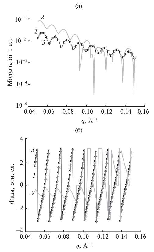 Рис. 5. Модули (а) и фазы (б) амплитуды отражения системы Al2O3// Nb(500 Å)/V(15 Å) в сравнении с данными по трем рефлектометрическим экспериментам: первое решение (1), второе решение (2), данные по трем экспериментам (3).