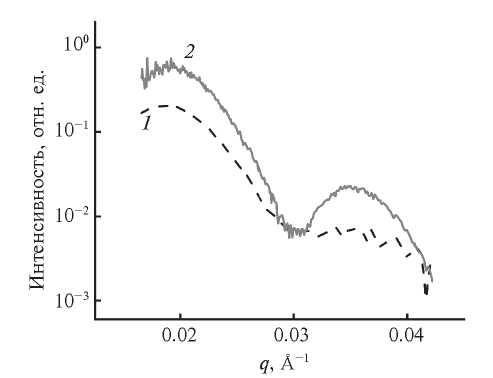 Рис. 6. Экспериментальные рефлектометрические кривые для системы Si//Cr(287 Å)/Fe(299 Å)/Cr(186 Å)/Gd(50 Å)/V(50 Å) при углах падения пучка нейтронов 3.1 мрад (1); 9.0 мрад (2).