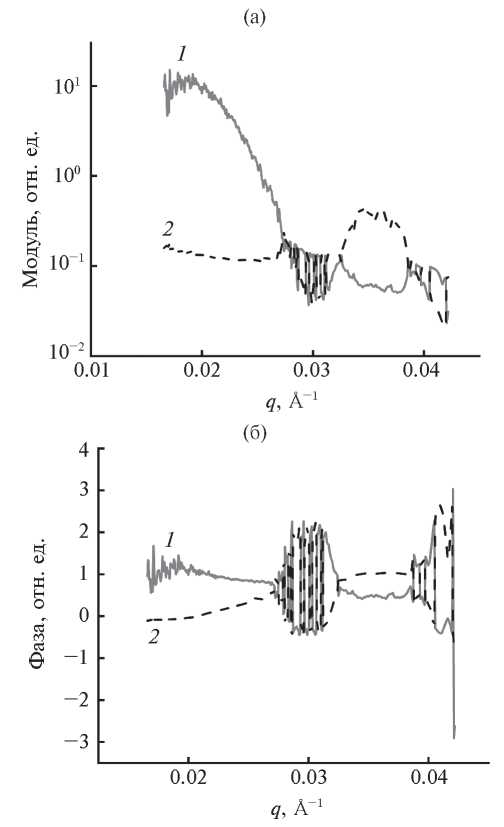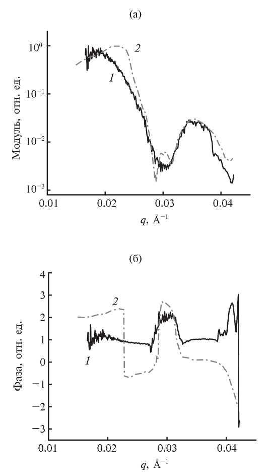 Рис. 8. Модули (а) и фазы (б) амплитуды отражения системы Si//Cr(287 Å)/Fe(299 Å)/Cr(186 Å): данные по двум экспериментам (1), данные по трем экспериментам (2).