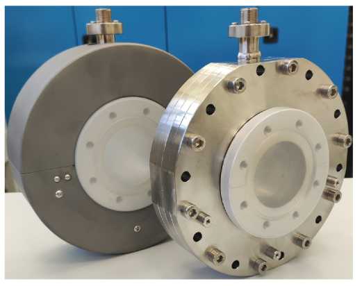 Существует большое количество конструкций ИДТ, реализованных на практике [5], в частности, наибольшее распространение в ускорительном сообществе получили датчики французской фирмы Bergoz Instrumentation [6]. Одним из возможных универсальных вариантов реализации является полностью вакуумированная конструкция на основе стандартных фланцев ConFlat с использованием вакуум-совместимых материалов, разработанная ИЯИ РАН (рис. 2). Фотография двух подобных ИДТ, изготовленных для проекта DARIA, представлена на рис. 3.