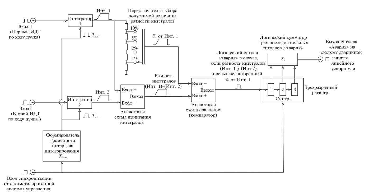 На вход ячейки поступают два сигнала от предварительных усилителей: основной сигнал от первого по ходу пучка ИДТ-1 и сигнал, сравниваемый с основным, от второго по ходу пучка ИДТ-2, а также импульс синхронизации, соответствующий частоте следования импульсов тока пучка в линейного ускорителя. Сигнал синхронизации запускает формирователь, который включает интеграторы на время длительности измеряемых импульсов тока пучка, в результате чего фактически сравниваются не амплитуды сигналов, а интегрированный заряд каждого импульса тока. Следует отметить, что границы интервала интегрирования Тинт должны быть выбраны максимально близко к фронтам импульса тока, для того чтобы минимизировать интегрирование паразитных фонов и наводок вне импульса. К выходу интегратора Инт.1 подключен многоступенчатый переключаемый резистивный делитель напряжения с отводами в 1, 2, 5, 10 % от входного. С выходов интеграторов сигналы Инт.1 и Инт.2 поступают на аналоговую схему вычитания (Инт.1 — Инт.2), и результат вычитания сравнивается на компараторе с выбранной на делителе долей основного интеграла Инт.1. Если результат вычитания, т. е. эффективные импульсные потери заряда пучка, превышает выбранный предел, то на выходе схемы сравнения появляется логический сигнал “Авария”.