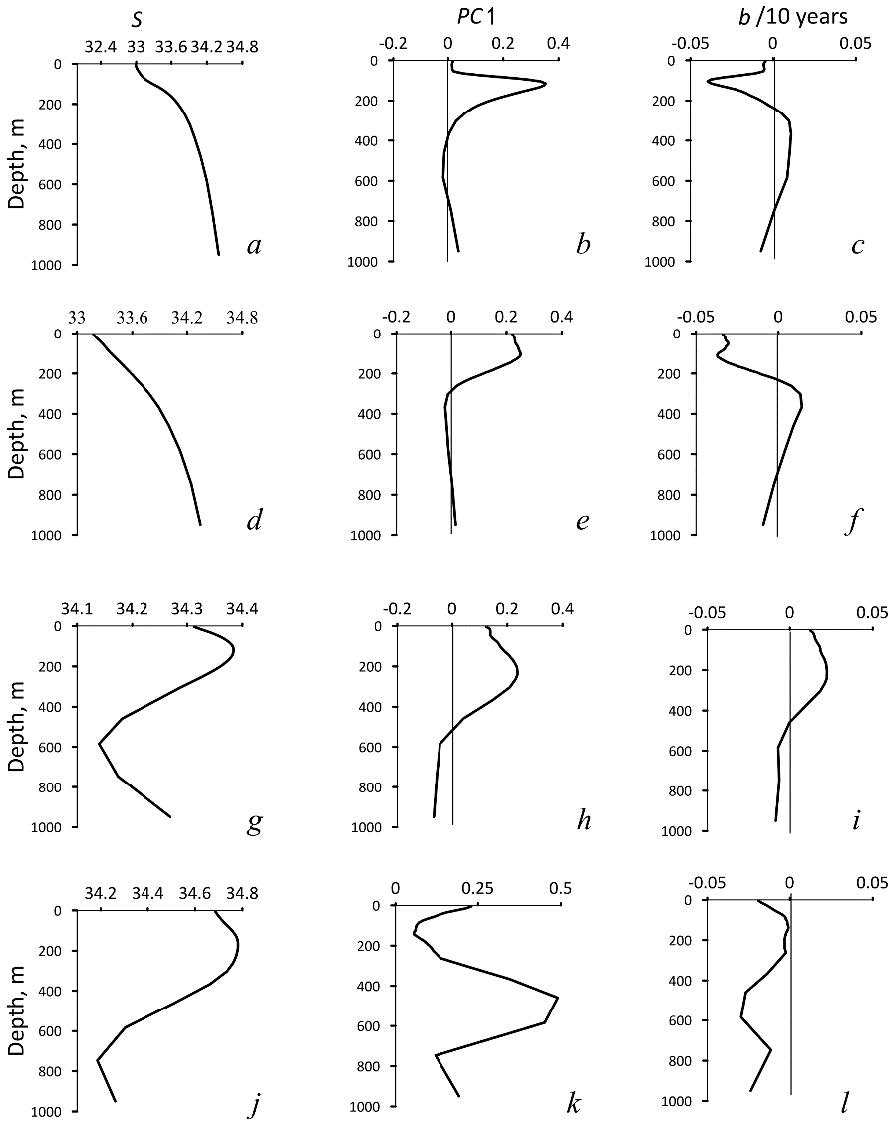 Fig. 2. Generalized curves of vertical distribution of salinity (a, d, g, j), principal component PC1 of the EOF of salinity anomalies (b, e, h, k) and salinity trend (b) at different levels (c, f, i, l) for 2000–2022. From top to bottom: the NE, NW, C, S regions according to Fig. 1, d