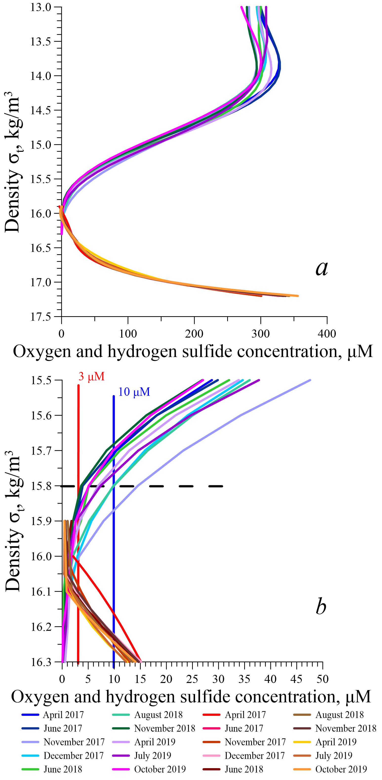 Vertical profiles of oxygen and hydrogen sulfide. Based on the vertical oxygen profiles obtained by averaging field data from six expeditions (dashed lines in Fig. 2), one can get the impression that in all cases the subsurface maximum of oxygen was observed and the beginning of oxycline (i.e. a noticeable decrease in oxygen concentration with depth) rose to the occurrence depth of isopycnal surface st = 14.0 kg/m3. However, when analyzing the oxygen sensor data (solid lines in Fig. 2), it becomes clear that the subsurface maximum of oxygen was observed only in April 2017 and the beginning of oxycline was still located near isopycnal surface st = 14.5 kg/m3 and was not subject to any seasonal changes since all four surveys in 2017 (April, June, November, December) showed that it remained at the same level.