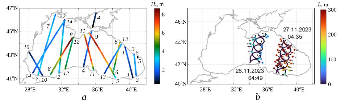 F i g. 2. Measurement data: a – satellite altimeter tracks indicating wave heights HS; b – tracks of the SWIM sensor (CFOSAT) with indicated direction (arrows) and wavelengths L (color)