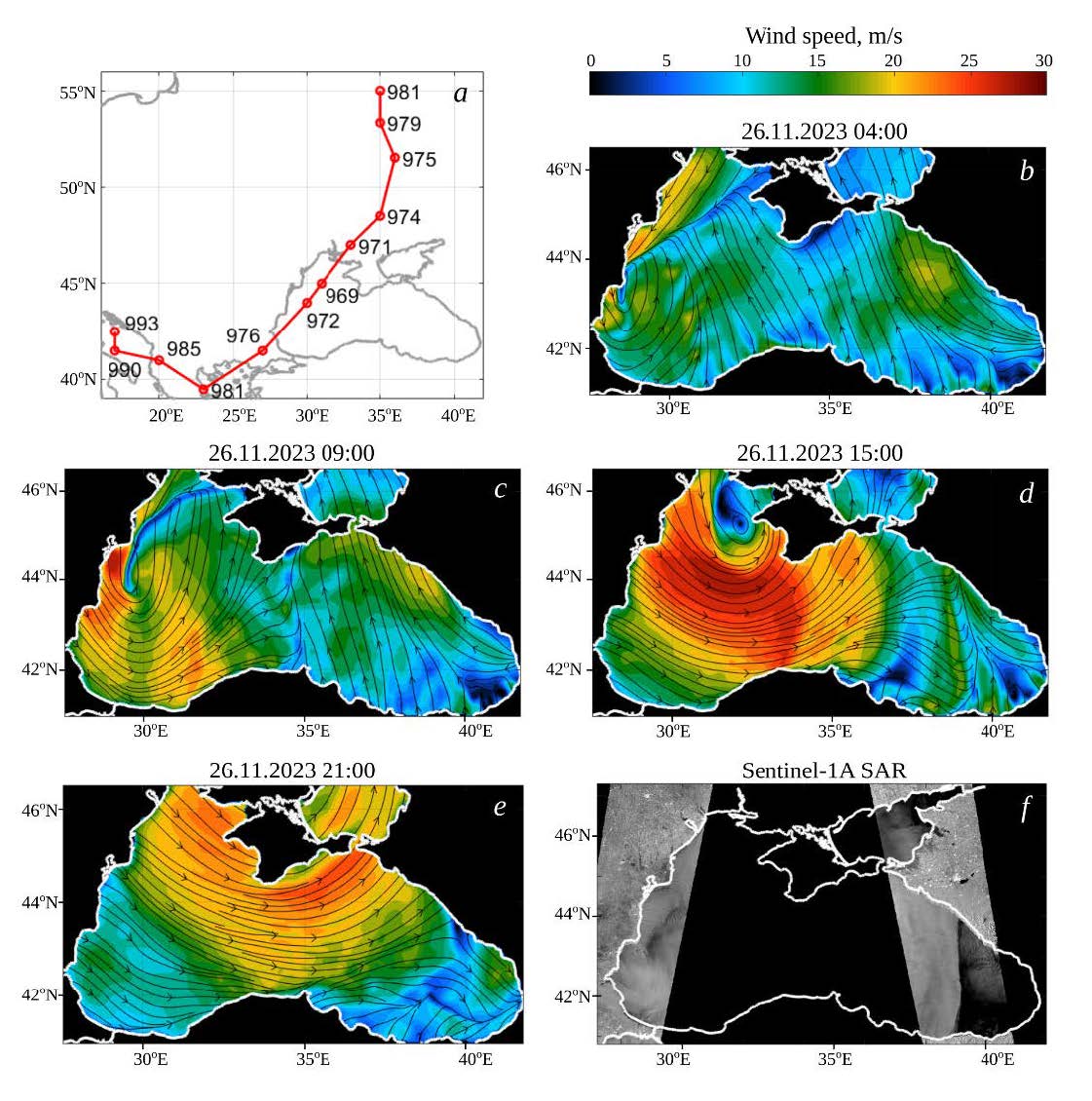 Wind field. The weather in the Black Sea region on 25–26 November 2023 was determined by a powerful extratropical cyclone with the center moving from the Balkan Peninsula through the Black Sea to Crimea and further to the north. Analysis of archived fields of sea level pressure, geopotential and the temperature on 25–27 November 2023 gives the following scenario for cyclone formation. The cyclone originated on the southeastern boundary of a deep, meridionally elongated trough in an area of strong horizontal temperature gradient. An intense and fairly compact cyclone is formed to the southeast of the trough, manifesting in the pressure field at sea level. Fig. 3, a shows its trajectory and pressure at sea level at its center (in hPa) according to the calculations using the WRF model. The time intervals between the graph points are 6 hours, the starting point (in the southwest) corresponds to 25 November 2023 (00:00). Cyclones with a similar trajectory are typical for the Black Sea region; traditionally they are called “southern” cyclones. They form over the Mediterranean Sea, move northeast, pass over the western part of the Black Sea and then move north across the territory of Russia. This type of Black Sea cyclone includes the well-known storm of 10–11 November 2007, which led to catastrophic consequences. It had almost the same trajectory and the maximum wind speed reached 30 m/s [36].