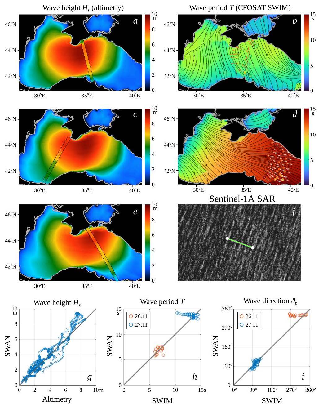 F i g. 6. Comparison of model calculations and satellite data: simulated wave height fields with the superimposed altimeter data from 26 November at 19:06 (a), 20:23 (c), 21:46 (e); simulated fields of wave periods and directions with the superimposed SWIM data from 26 November at 04:49 (b) and 27 November at 04:35 (d); fragment of SAR image with the superimposed line of 1 km long (f). Comparison of simulations and satellite data in terms of wave heights (g), periods (h) and directions (i)