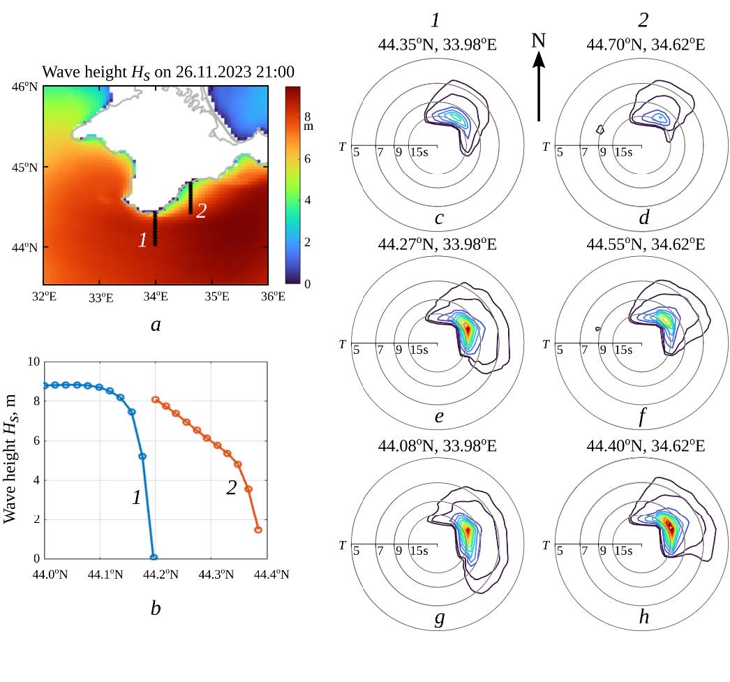 F i g. 8. Shadowing of waves by the Crimean Peninsula: a – transects 1 and 2 superimposed on the simulated field of wave heights; b – wave height along transects 1 and 2; frequency-angular spectra of waves along transects 1 (c, e, g) and 2 (d, f, h), where the circles (from larger radius to smaller one) correspond to wave periods 5, 7, 9, 15 s