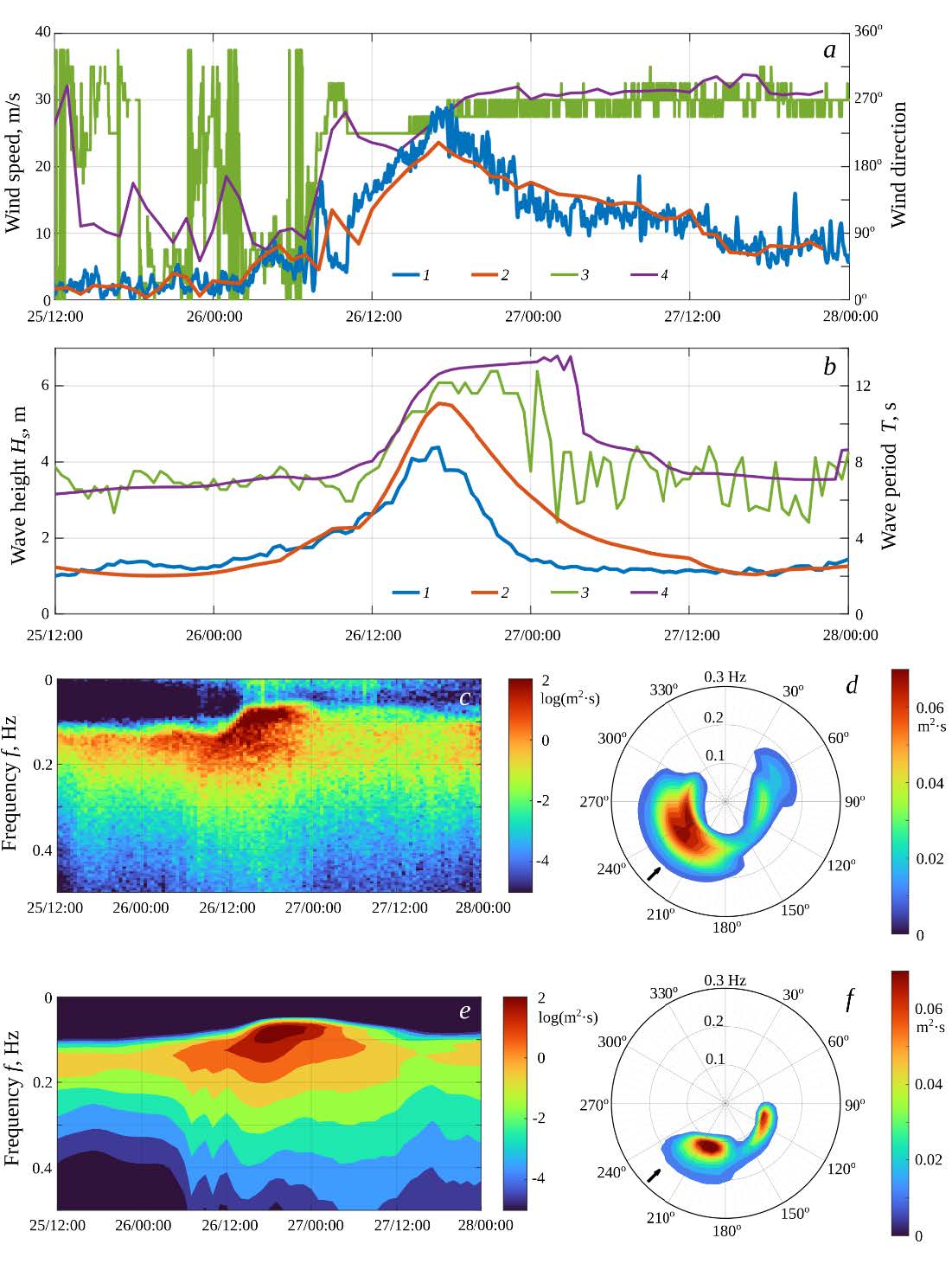 The frequency-angular spectra of waves were calculated from 24 November (00:00) to 28 November (00:00). The fields of significant wave height , the direction of waves at the frequency of spectral peak and the period of the spectral peak waves were used for analysis. Below, the and T characteristics will be called the height, direction and wave period for brevity.