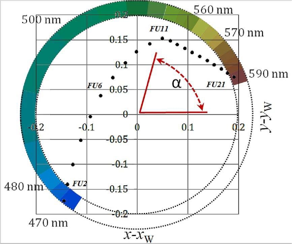 For any given point (x, y) on the chromaticity diagram, the value of hue angle a is defined as the value of the angle (in degrees) between the segment connecting the “white point” with the given point (x, y) and X axis [2]. That is, the hue angle a (in degrees) is determined by the following expression: