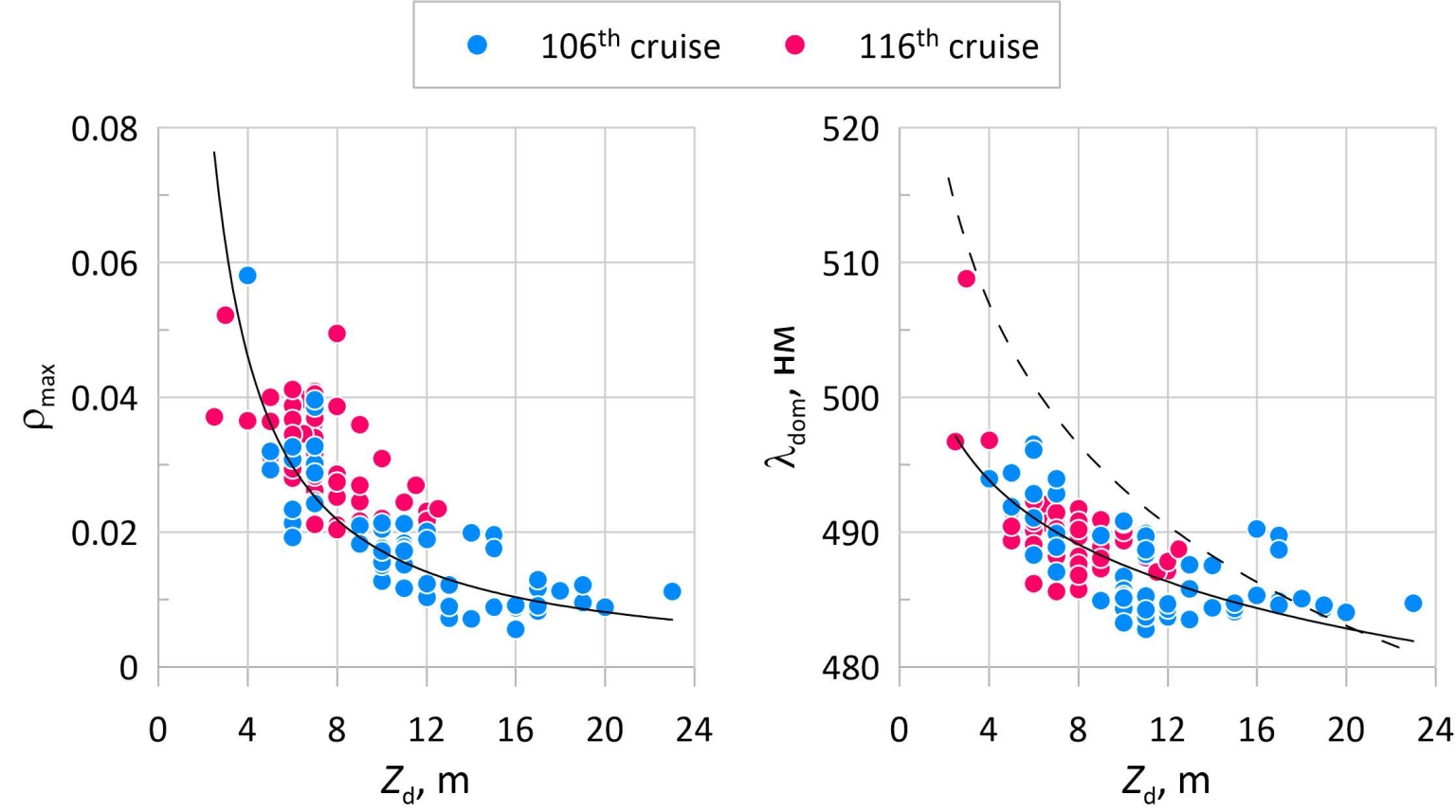 The intersection of the curves λdom = f(Zd) at Zd = 20 m (Fig. 5, right) can be explained as follows. The concentration of fine suspended matter in the sea decreases from coastal areas, where it reaches its maximum, to central regions due to gradual deposition of fine suspended matter. In areas with Zd = 20 m, the concentration of fine suspended matter was the same as in the waters of the tropical Atlantic Ocean.