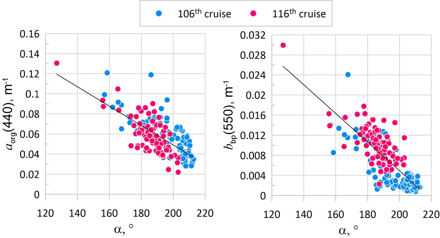 The approximation of relationship between backscattering by suspended particles bbp and the hue angle a in the Black Sea waters is also presented in the form of a linear relationship (Fig. 7, right):