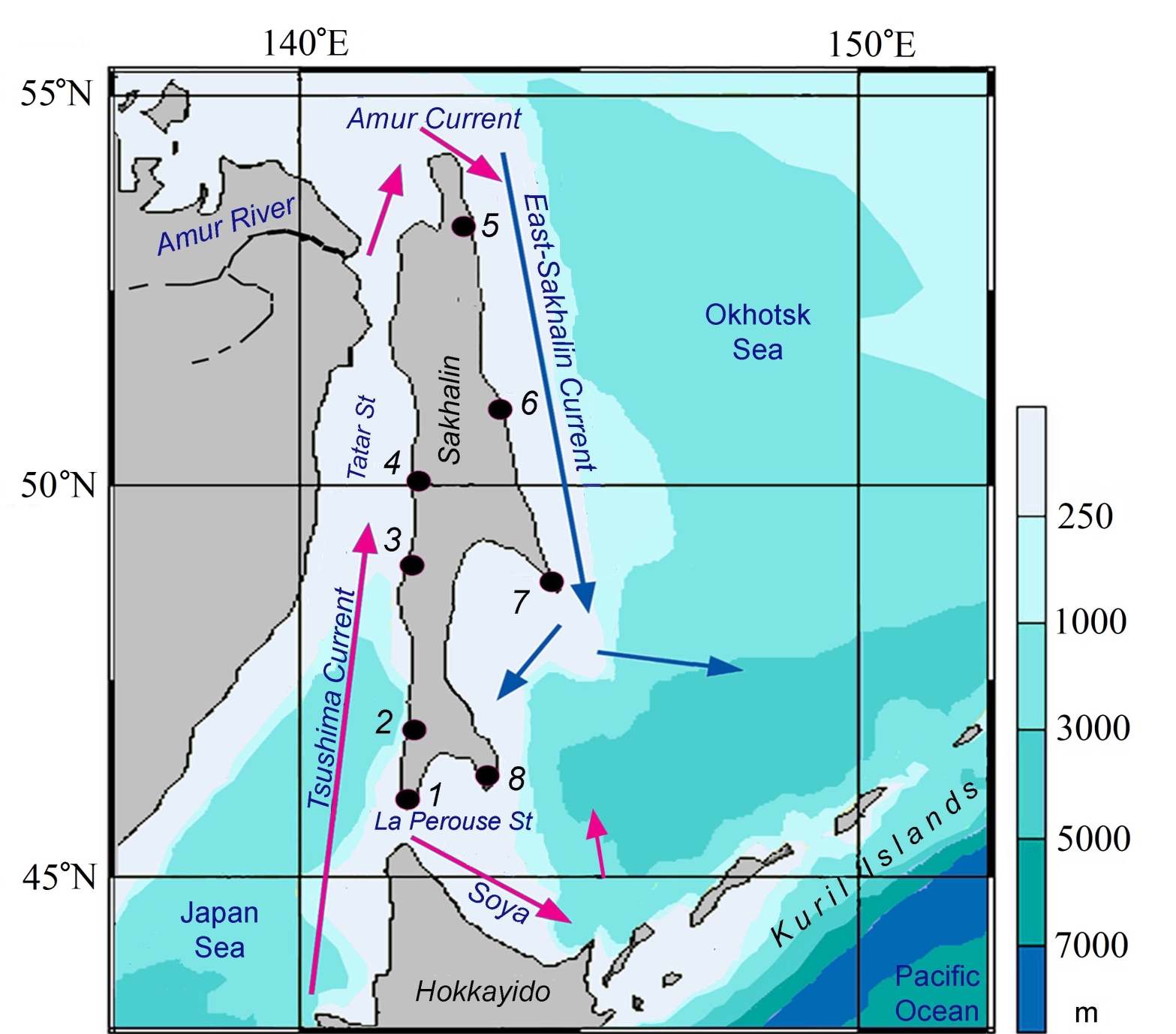 - Pishchal'nik, V.M., Arkhipkin, V.S. and Leonov, A.V., 2010. On Water Circulation in Tatar Strait. Water Resources, 37(6), pp. 759-772. doi: 10.1134/S0097807810060035