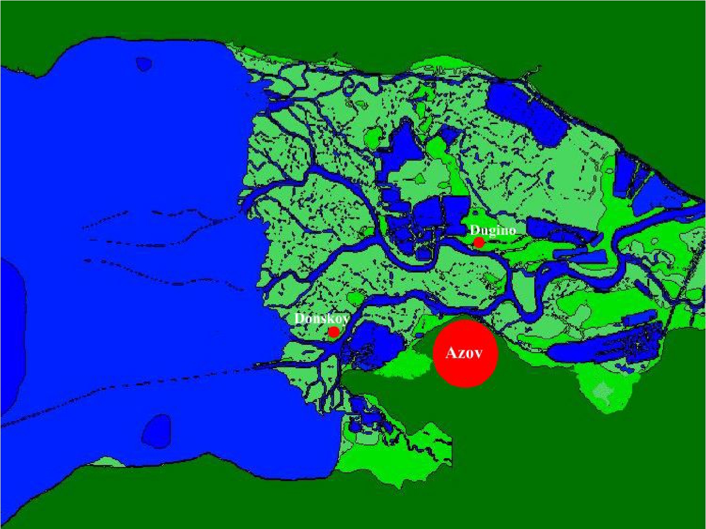 Fig. 3 shows the Don delta region in its initial state, when level oscillations are insignificant. The water surface, including the Don branches and fish-breeding ponds, is highlighted in blue; the area with possible flooding is highlighted in light green. Fig. 4 shows the same area at the time of the maximum water level rise at 18:00 on 24 September 2014. The error in calculating the water level in the khutor of Donskoy was 17%.