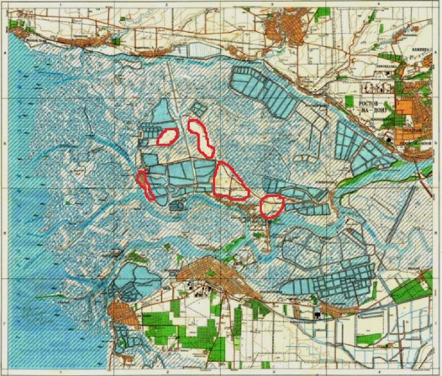 F i g. 5. Scheme of the flooded area of the Don River delta on 24 September 2014 (highlighted by hatching) performed by A.Yu. Moskovets