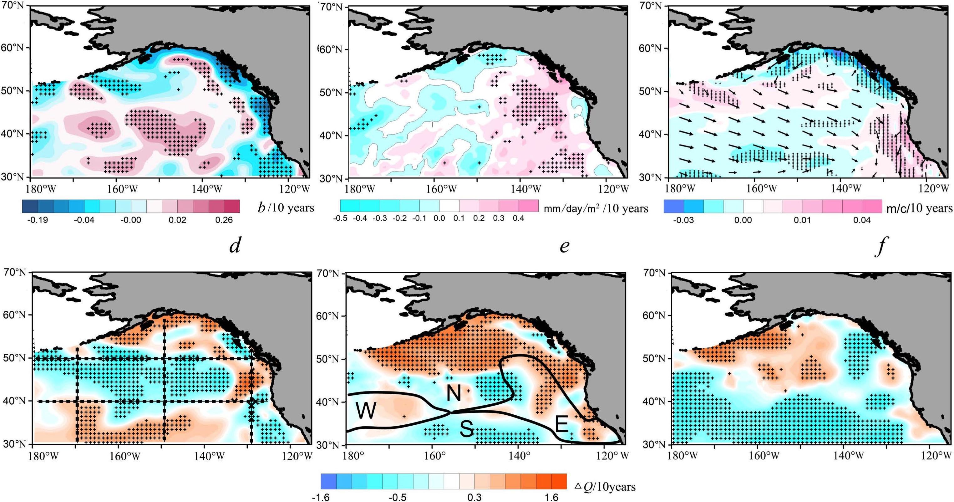 Formation of trends in interannual changes in salinity on meridional sections at 170°, 150° and 130°W (no Figure) occurs under the conditions of significant spatial gradients of the salinity field (Fig. 3, c, d; 1, d). Note that the maximum negative salinity trends with values up to −0.07/10 years were localized at levels of 70 and 120 m in the northern part of the western section (170°W) near the Aleutian island ridge. Areas with maximum values of positive trends S (0.06/10 years) can be observed in various parts of the upper and intermediate layers in all sections under consideration, where they are elongated in the latitudinal direction.