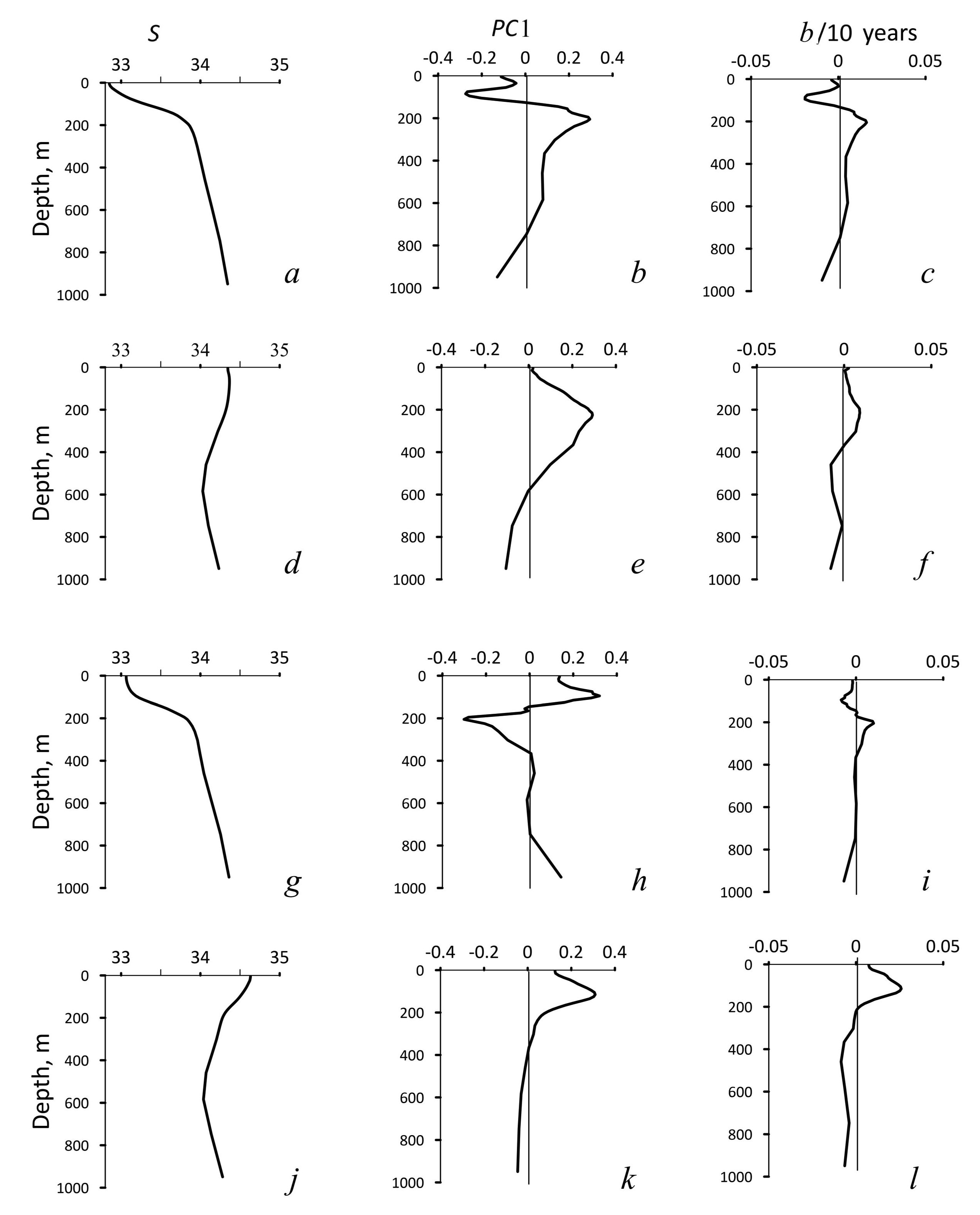 F i g. 2. Generalized curves of vertical distribution of salinity (a, d, g, j), principal component PC1 of EOF of salinity anomalies (b, e, h, k) and salinity trend (b) at different levels (c, f, i, l) for 2000–2022. From top to bottom: the N, W, Е and S areas according to Fig. 1, e