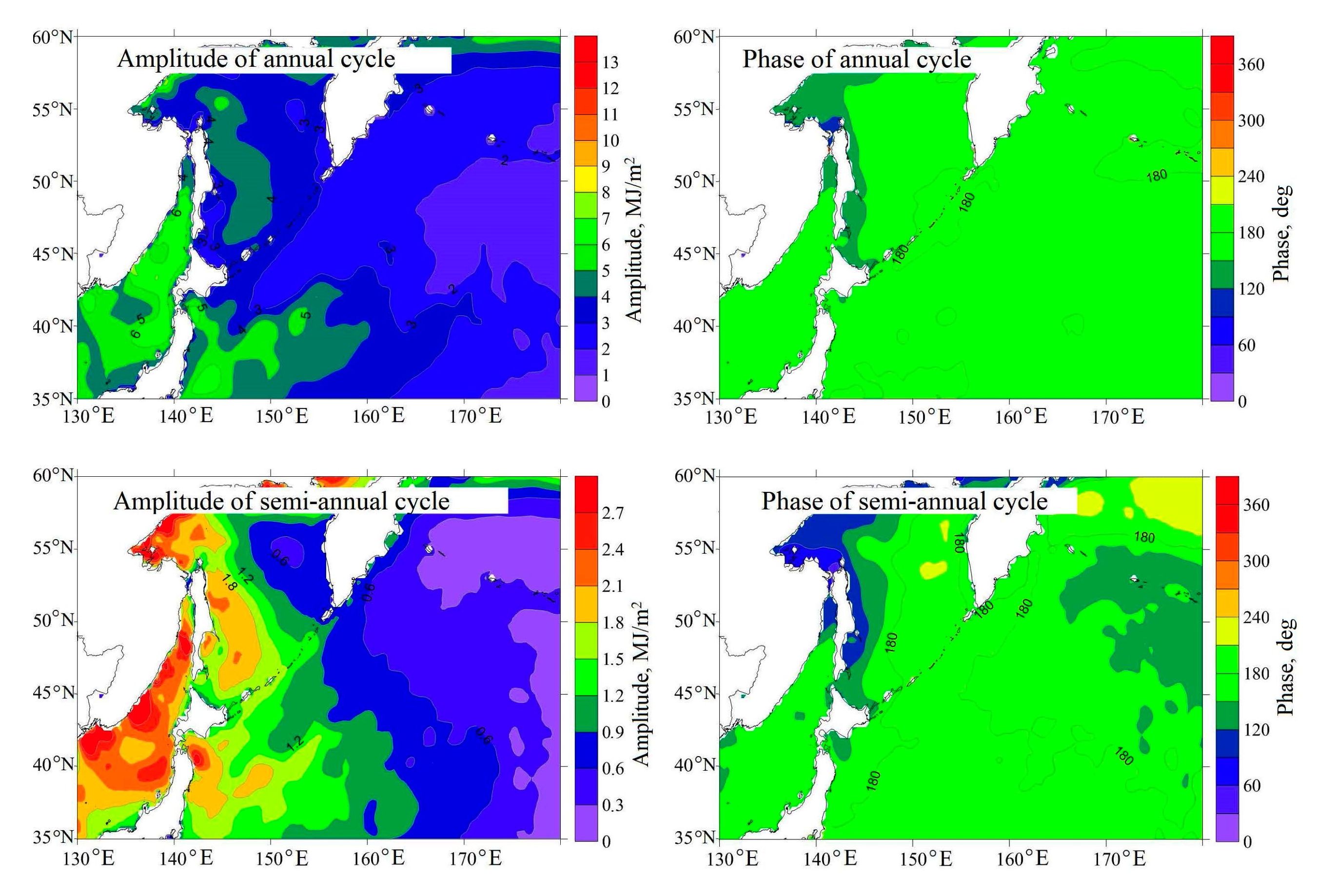 Noticeable amplitudes of the semi-annual component were noted in areas with a complex annual cycle which is not well described by the annual cycle. Such areas include the northwestern part of the Sea of Okhotsk, coastal zones off the coast of the Sakhalin, Hokkaido and Honshu Islands (from the eastern side).
