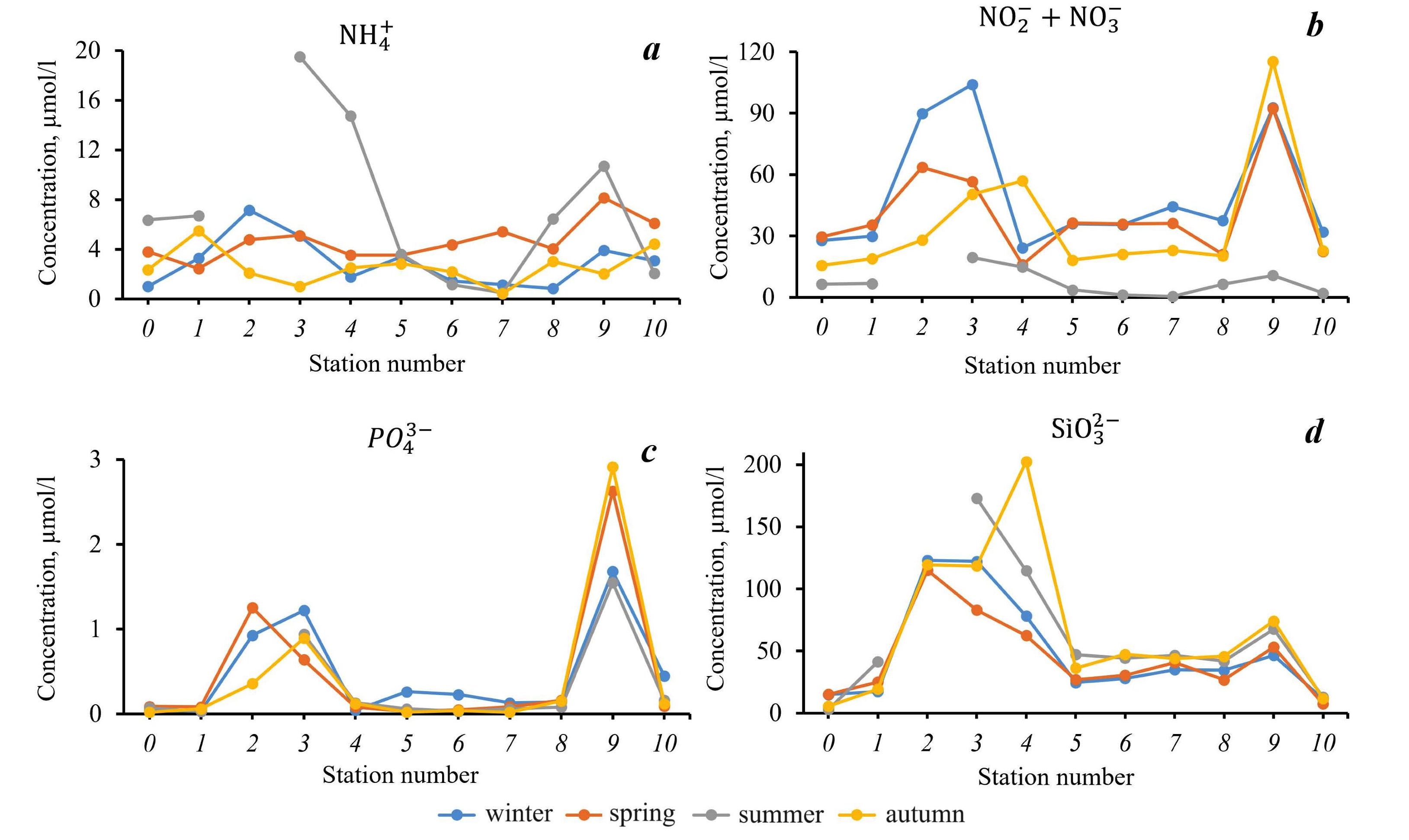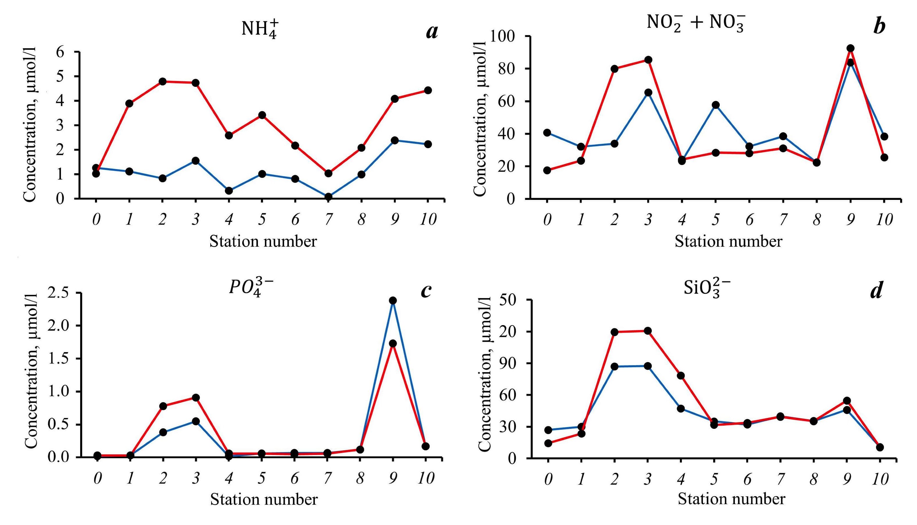 Methods of chemical analysis. Concentration of the sum of nitrates and nitrites was determined by the spectrophotometric method (RD 52.10.243-92) on an automatic flow multichannel analyzer of nutrients Scalar San++ (Netherlands). The method is based on the reduction of nitrates to nitrites through a copper-plated cadmium reducer. At the minimum detectable concentration of the sum of nitrates and nitrites of 0.36 µmol/l, the error is ±0.20 µmol/l. The content of ammonium ions was determined by the modified spectrophotometric method of Saggi – Solorzano [11] based on the phenol-hypochlorite reaction with the formation of indophenol in the concentration range of 0.1–15.0 μmol/l with an error σ equal to ±12%. The phosphorus concentration was determined by a spectrophotometric method based on the formation of a blue phosphomolybdenum complex with a concentration measurement range of 0.05–100.0 µmol/l; the maximum error of the method is ±15% (RD 52.10.243-92). The silicon concentration was determined by the spectrophotometric method (RD 52.10.243-92) based on the formation of a blue silicomolybdenum complex with a range of determined concentrations of 0.05–80.0 µmol/l. The error of the method ranges from 3 to 20%.