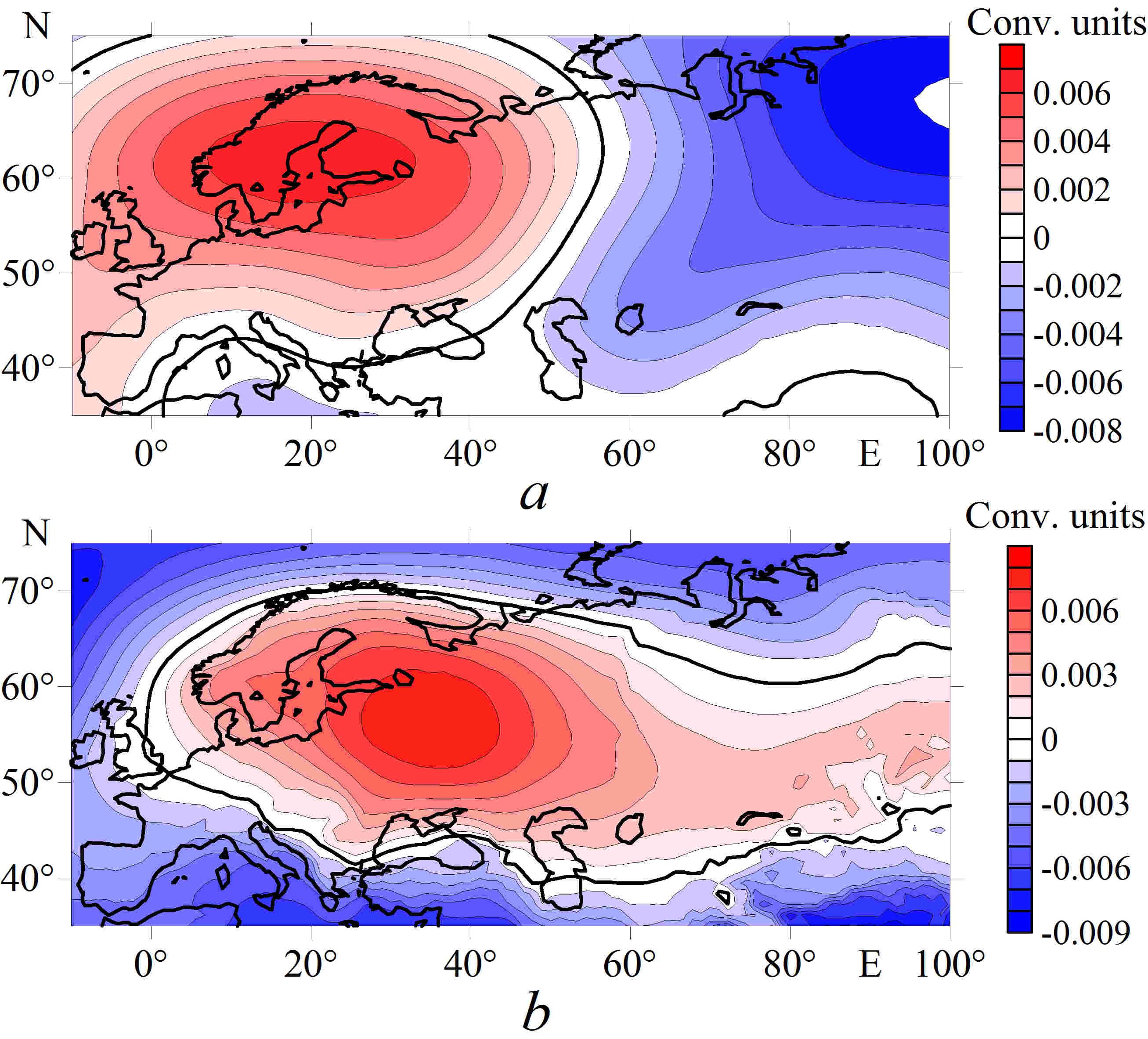 The EOF method made it possible to identify the leading spatial modes for cases with steady winds in the Black Sea. As a result of the analysis, we obtained the first-mode spatial structure of 500 hPa geopotential height containing 65% of the variability (Fig. 1, a). Distribution includes a large area of positive geopotential height anomalies covering the north of Europe and extending to the Ural Mountains/Caspian Sea. The anticyclone center is located in the Scandinavian Peninsula which is typical for the position of a blocking anticyclone (blocking).