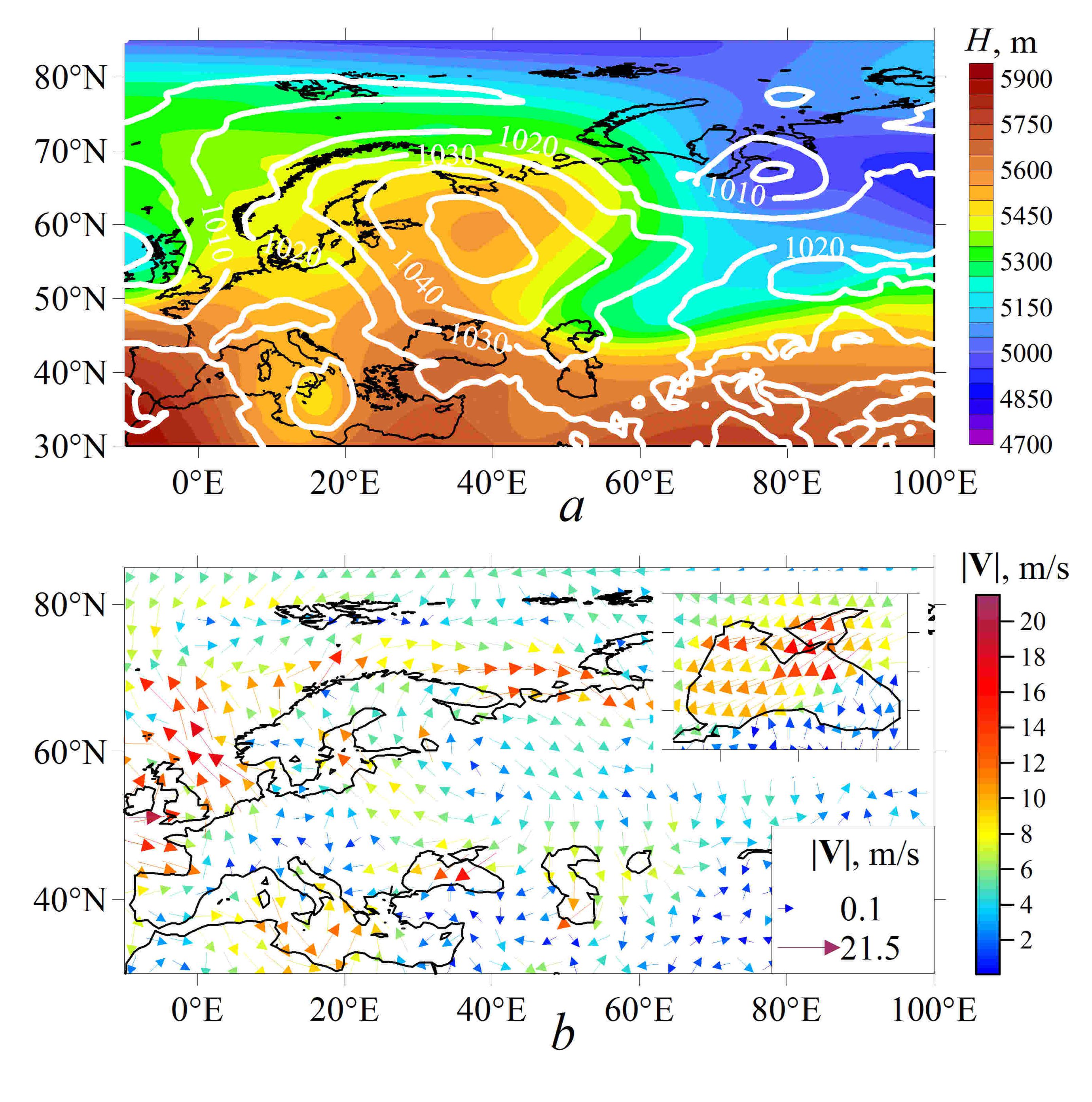The opposite situation developed in the Arctic region at that time. The realigning of large-scale circulation that took place during these months created favorable conditions for intensive advection of warm air from Western Europe and from the Atlantic Ocean to the central region of the Arctic Basin (Fig. 3, b). In the Arctic region, average monthly air temperature anomalies exceeded 15 °C [39]. At the same time, a polar air invasion from northern Siberia to the European part of Russia, central and southern Europe (Fig. 3, b) accompanied by severe frosts took place and a cold wave was also observed in eastern Asia [41].