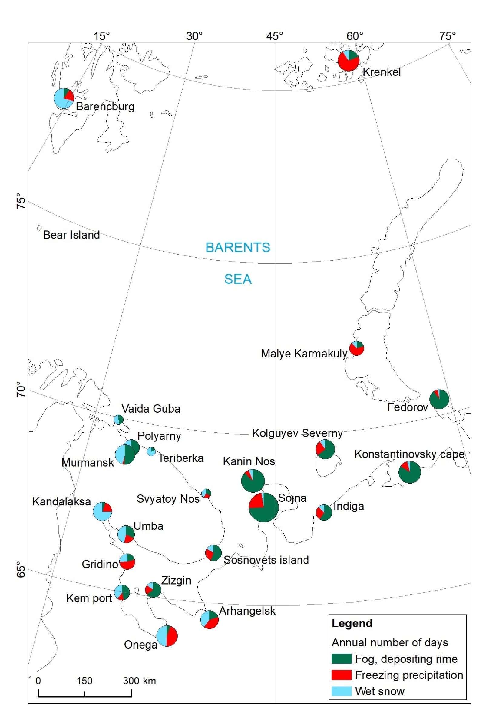 The spatial distribution pattern of the number of days with freezing precipitation is extremely heterogeneous. However, we can make some assumptions regarding this distribution. Glaze ice is least common at Konstantinovsky Cape and Fedorov station. These are weather stations located in the southeast of the Barents Sea and in the Kara Strait on the Kara Sea side, respectively. In this location, there is a low frequency of warm fronts with thermal stratification of the “warm nose” type with a characteristic raised layer of warm air, leading to the formation of freezing precipitation. Low frequency of freezing precipitation in the Murmansk area can be due to the immediate proximity of the Murmansk Coastal Warm Current which promotes the existence of a warm lower layer of the atmosphere preventing the formation of freezing precipitation.