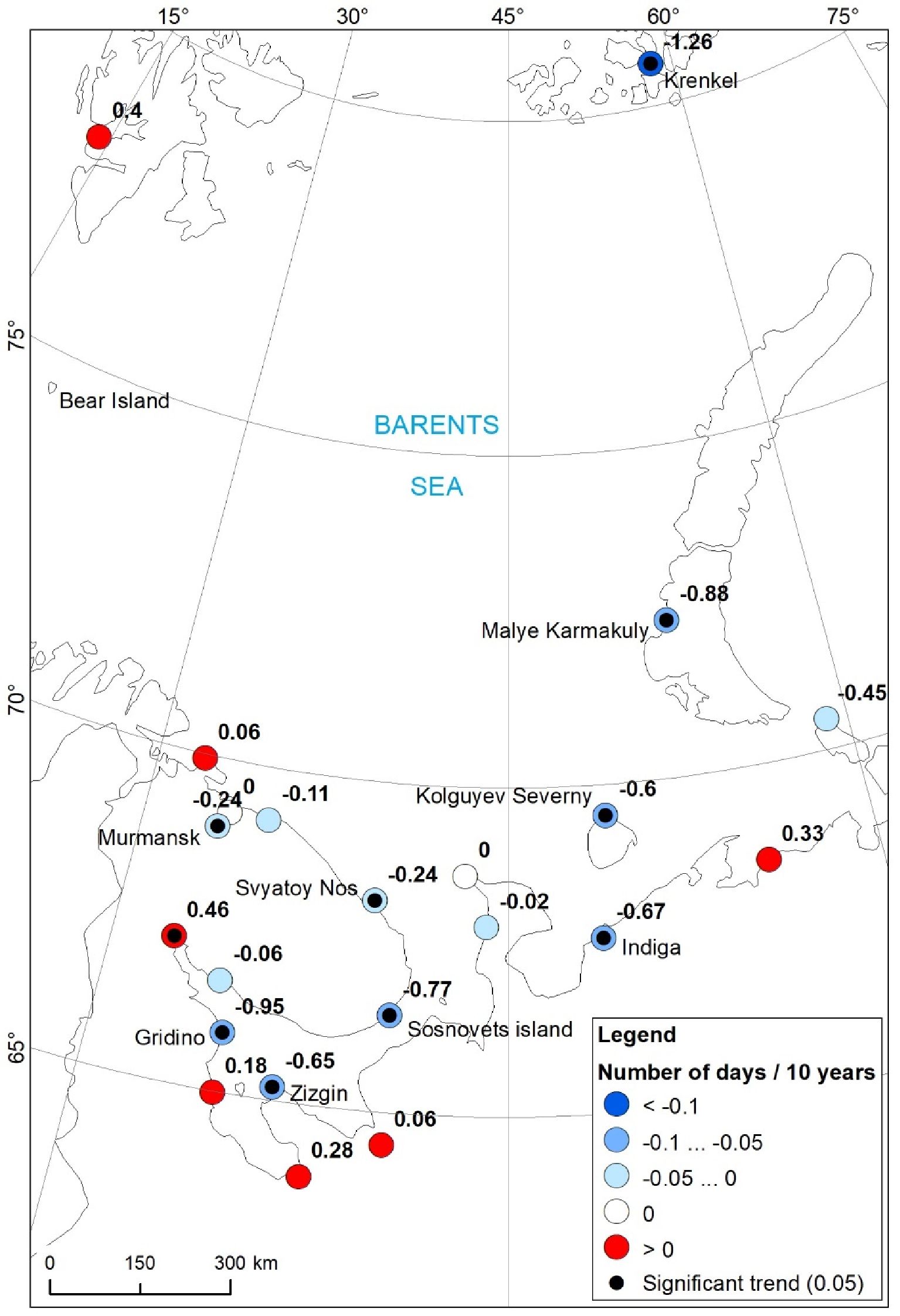It follows from the map that negative trends are observed mainly in the territories facing the coasts of the White and Barents Seas. Positive trends are usually observed at weather stations with a more continental location. Almost all significant trends have a negative sign. The exception is Kandalaksha weather station where the wet snow have contributed to the positive trend the most.