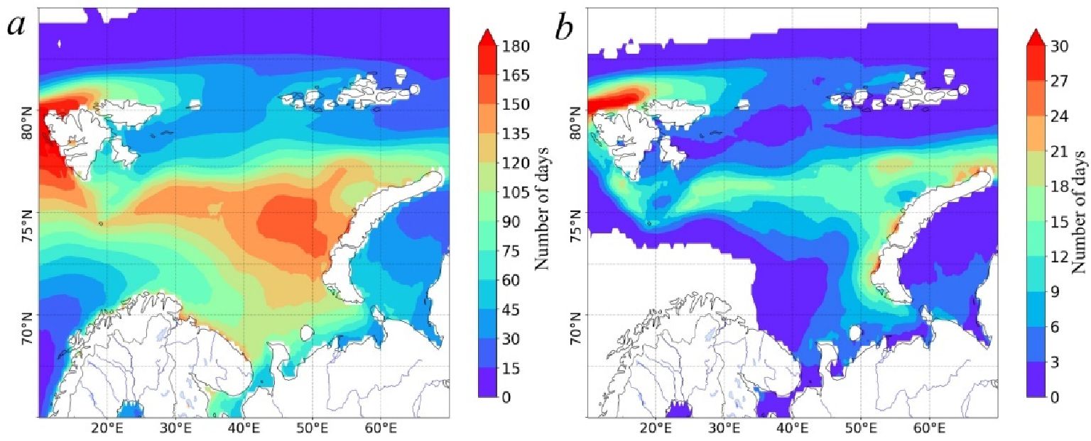 Fig. 3. Average annual number of days with vessel icing (a) and extreme icing (PPR > 83) (b) in the Barents Sea for the period of 1979–2022