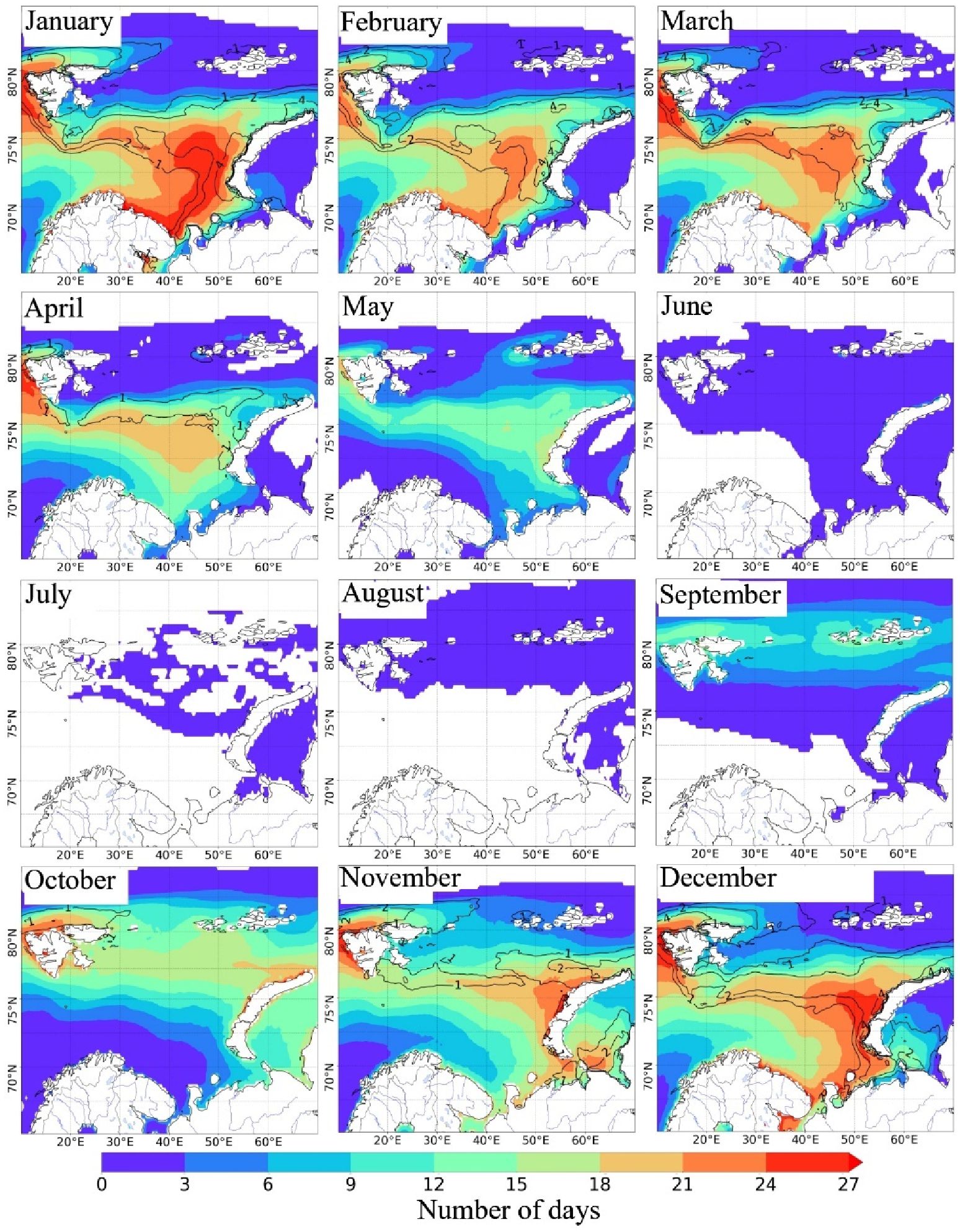 Further, we will consider annual course of number of days with spray icing in the Barents Sea (Fig. 4). Maps of the number of days with sea icing were plotted for each month of the year. The results revealed that the greatest number of days with icing were observed from October to April. In the areas most favorable for icing, this phenomenon is observed, on average, almost every day (more than 27 days per month). The smallest number of days with icing is observed in July.