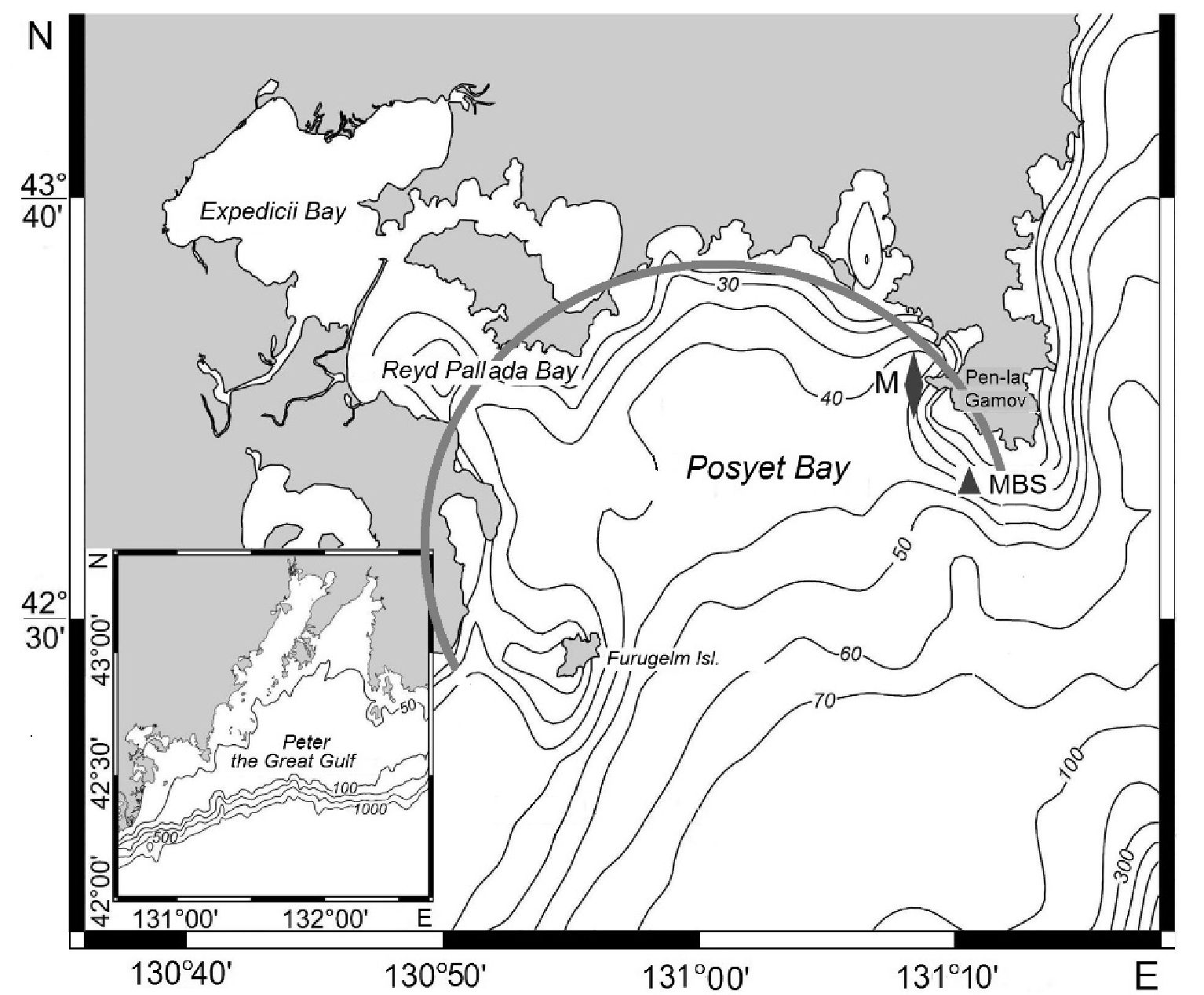 Fig. 1. Map-diagram of Posyet Bay. The inset shows Peter the Great Gulf